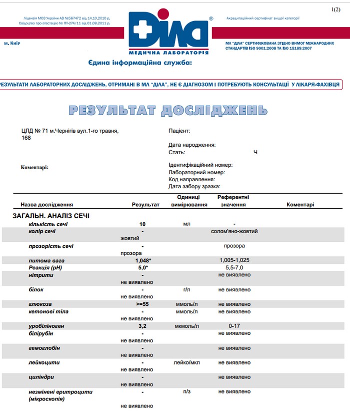 После того как мне выдали направление я купил два контейнера для анализов и упаковку одесского яблочного сока «Наш сік», который пользуется уважением у черниговских мам. Для объективности эксперимента сдать яблочный сок на анализ я решил не только в государственную лабораторию, которая находится в 114-м кабинете на первом этаже второй городской больницы, но и в частную. Частная лаборатория «Diлa» также находится в здании больницы. Стоимость общего анализа мочи – 53 гривны. Результаты можно забрать лично, получить по факсу либо на электронную почту.