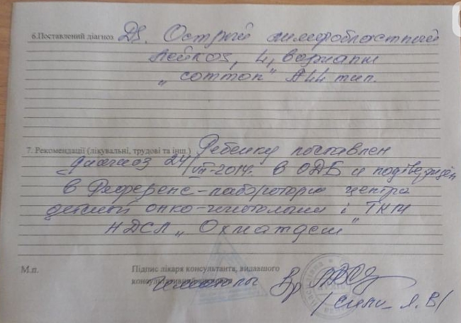 24.07.2014 року дворічному Тимофійчику поставлено та підтверджено діагноз захворювання - гострий лімфобластний лейкоз, 4, варіант «common» A 44 тип.