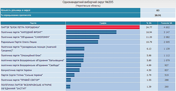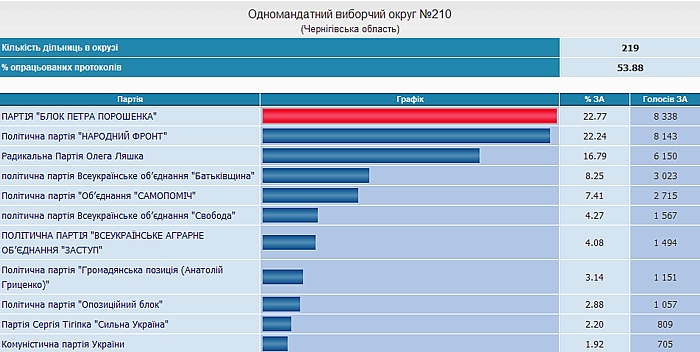 ЦИК обнародовала информацию о подсчете голосов Черниговцев за политические партии. Итак, по состоянию на 16:00, 27 октября, подсчет выглядит таким образом: