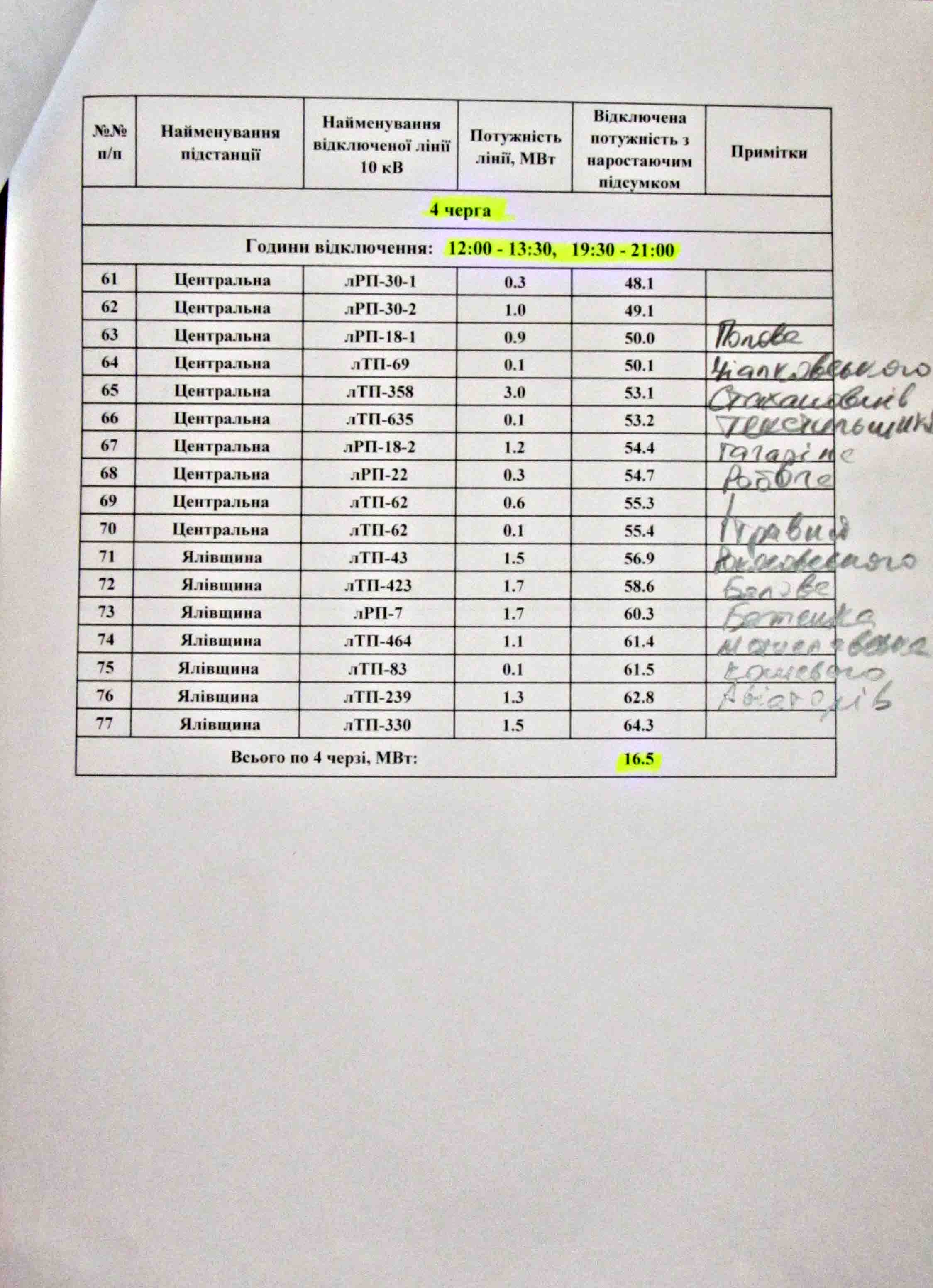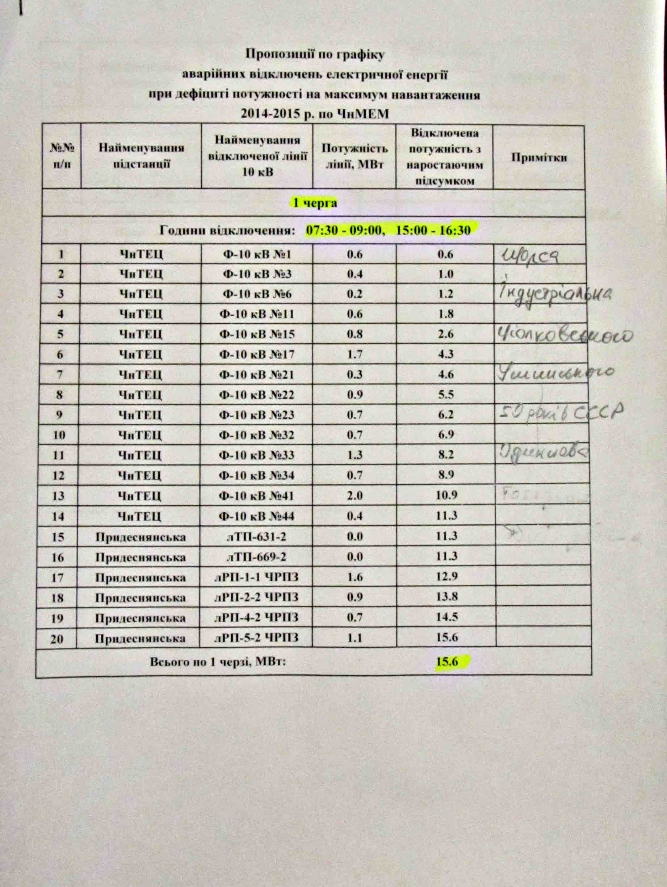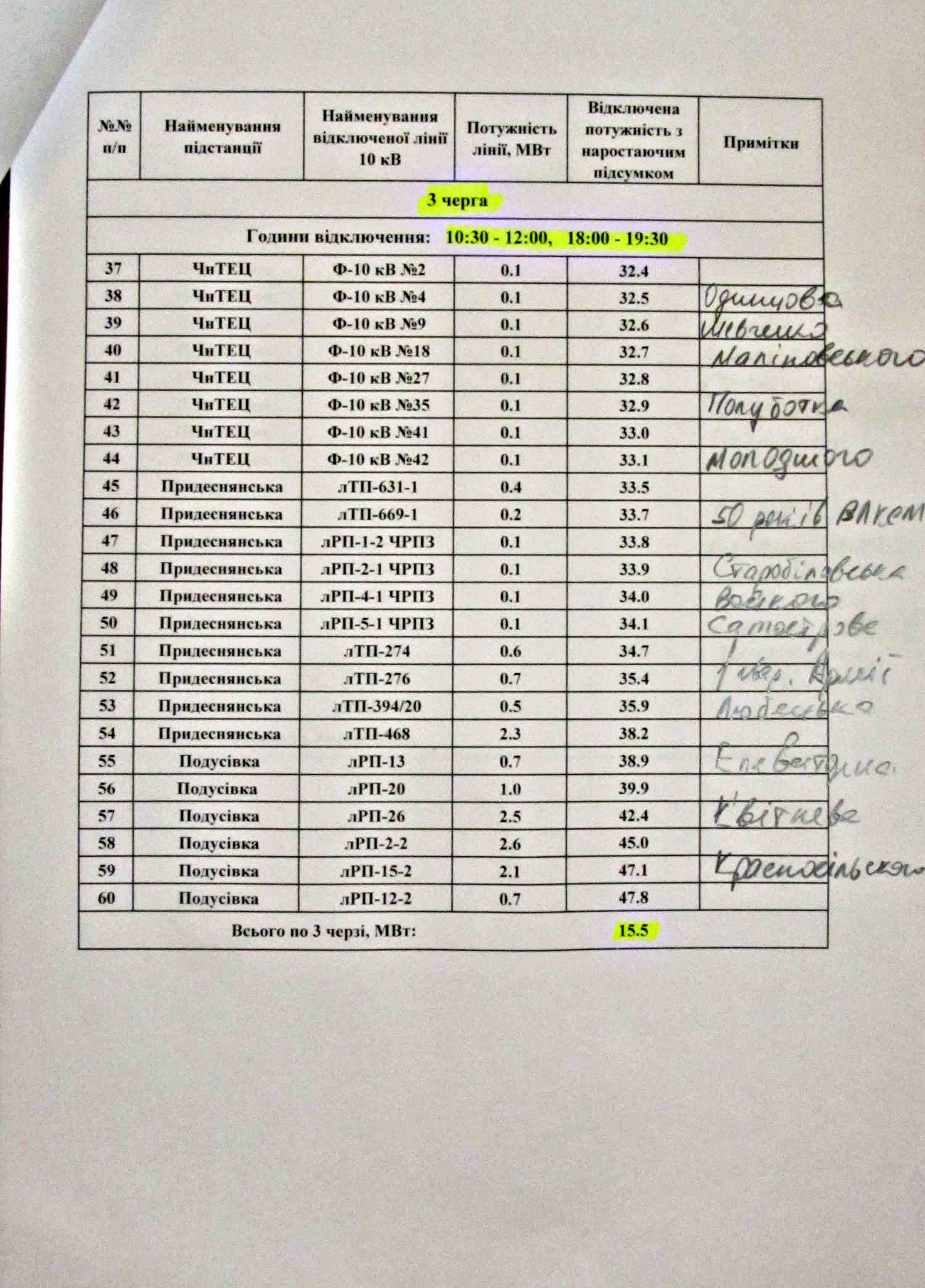 У Чернігові орієнтовно визначено 5 черг аварійного відключення електроенергії упродовж доби: