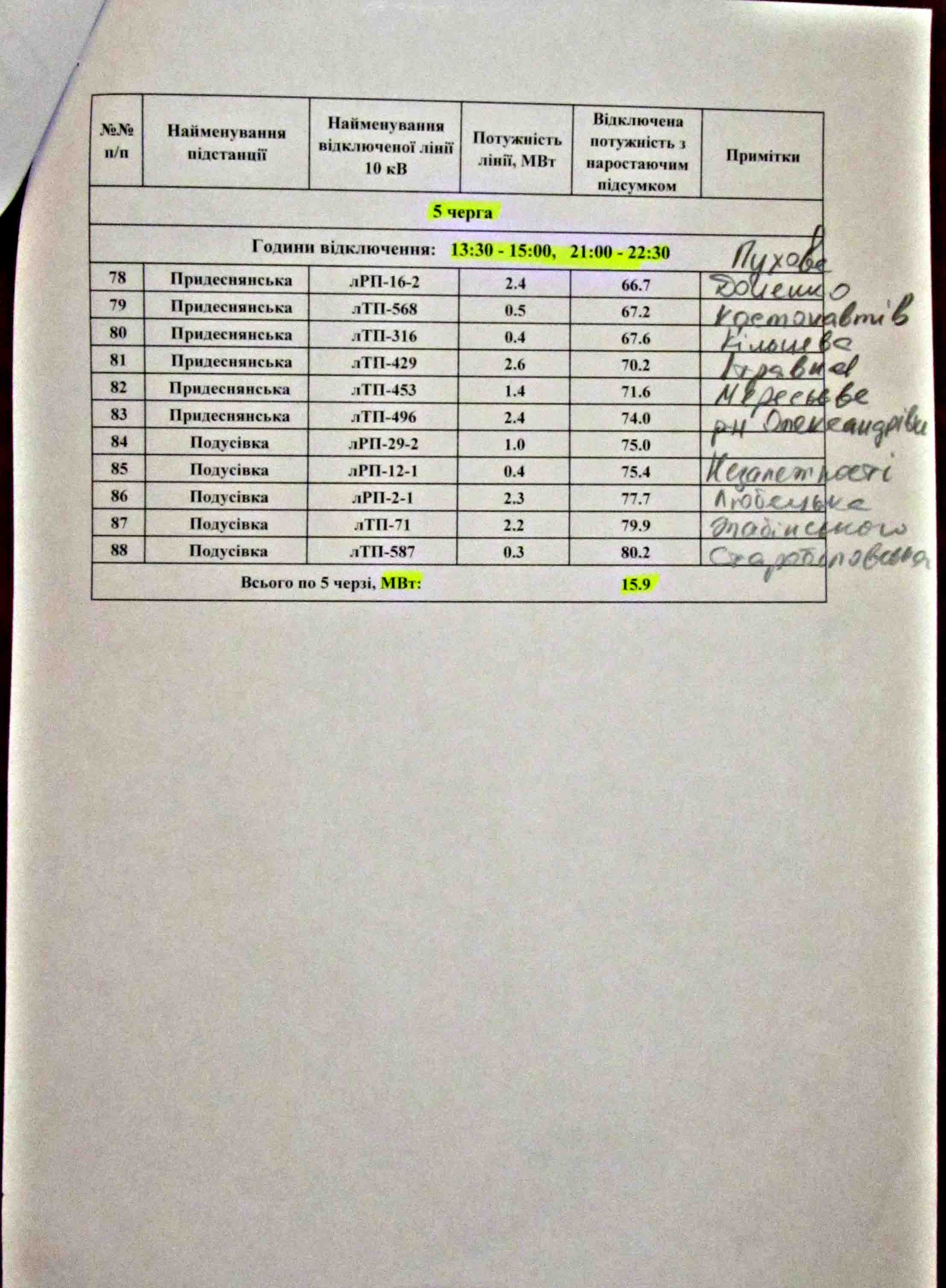 V черга – 13.30 – 15.00, 21.00 – 22.30 – у межах вул. Пухова, Доценка, Космонавтів, Кільцева, район Олександрівка,частина вул.Незалежності, частина вул. Любецької, вул. Жабинського, Старобілоуська.