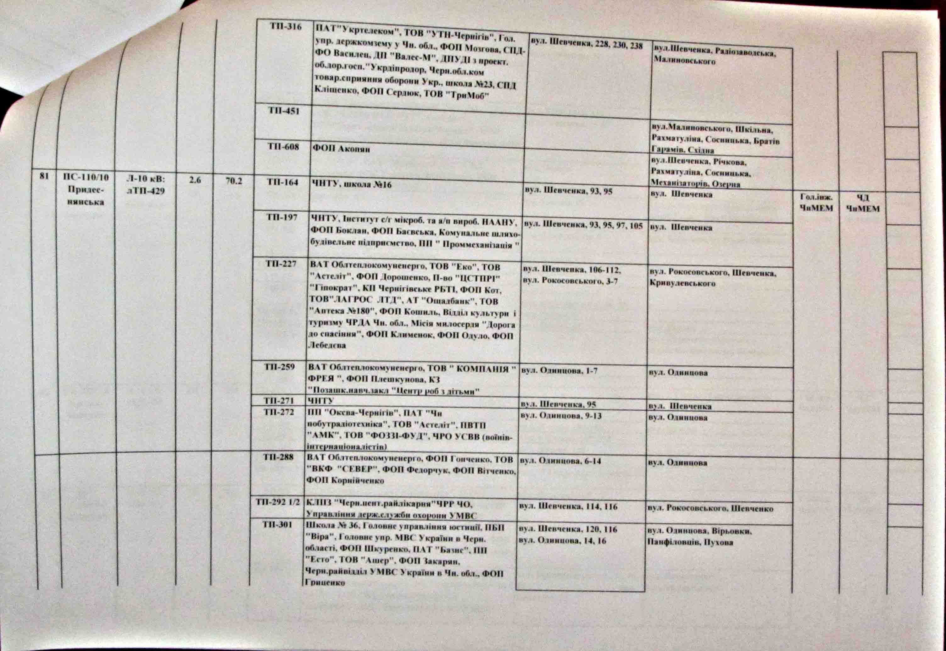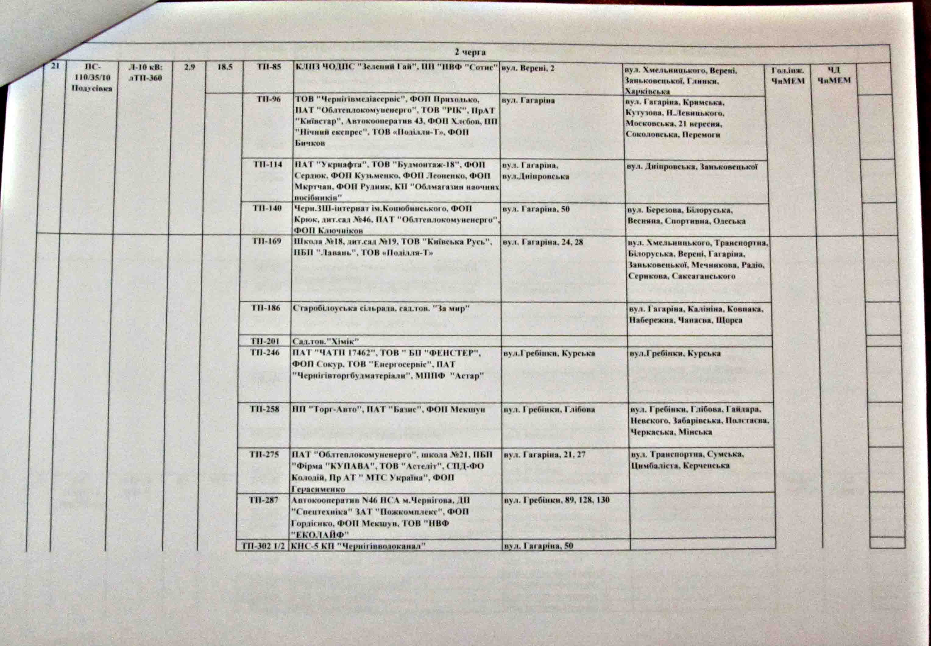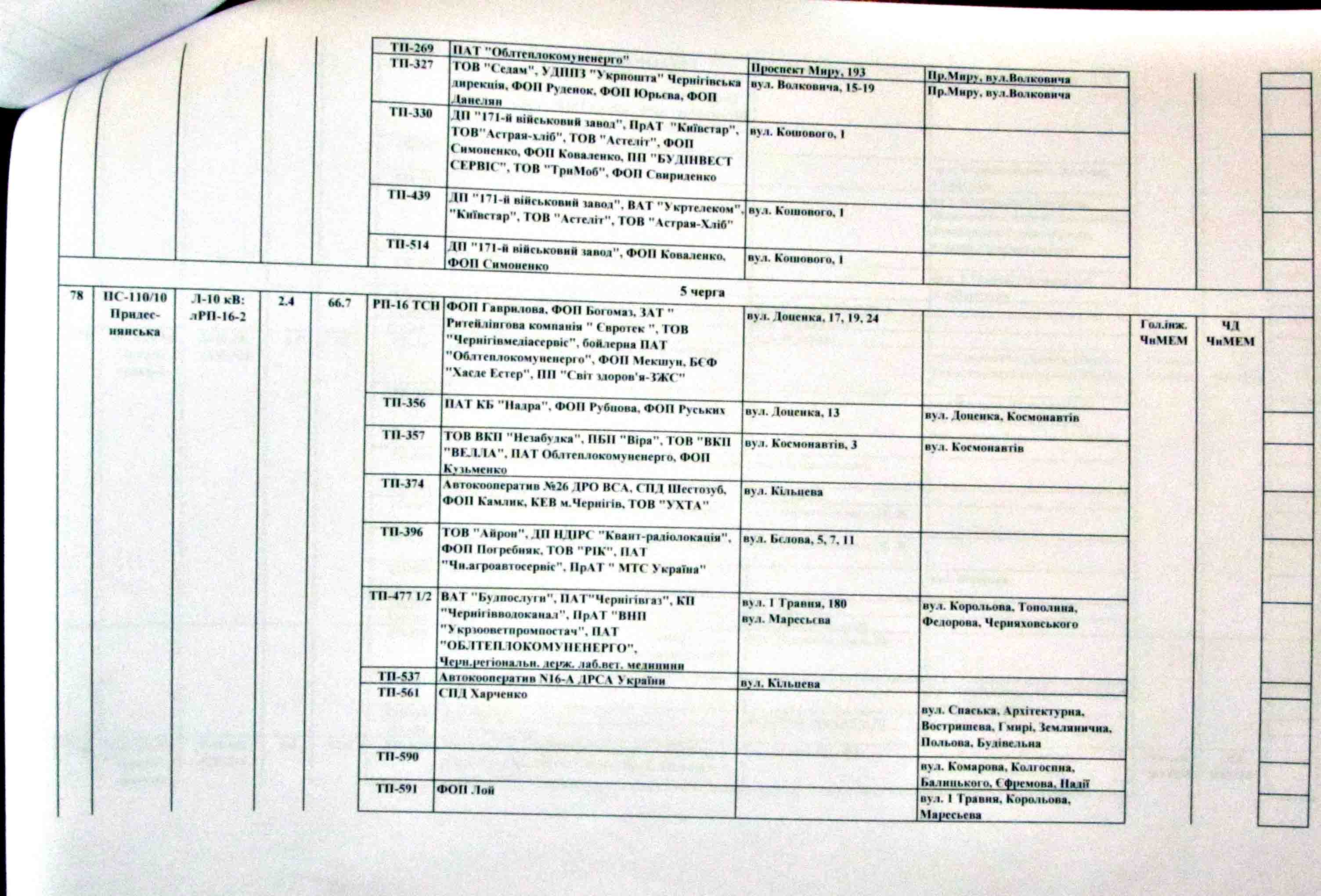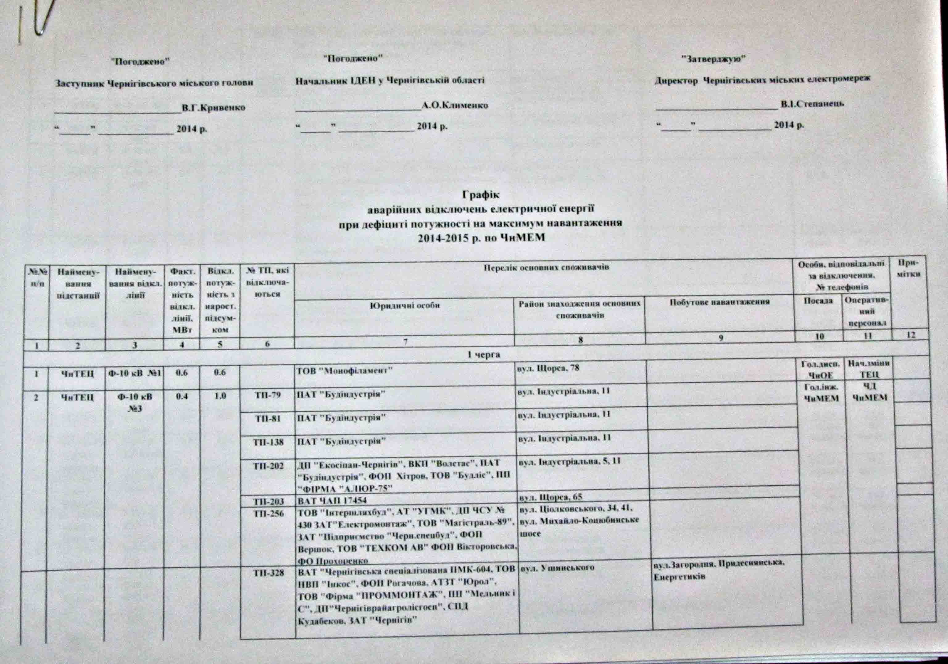 Графики отключения в электронном виде обещали разместить на сайте ПАТ «Черниговоблэнерго» в понедельник, 8 декабря. На данный момент редакция сайта располагает фотокопиями графиков отключения: как сокращенной, так и полной версией. В полной версии графика указаны не только очереди отключения, но и улицы на которых не будет электроэнергии, а также основные объекты, которые на этих улицах расположены.