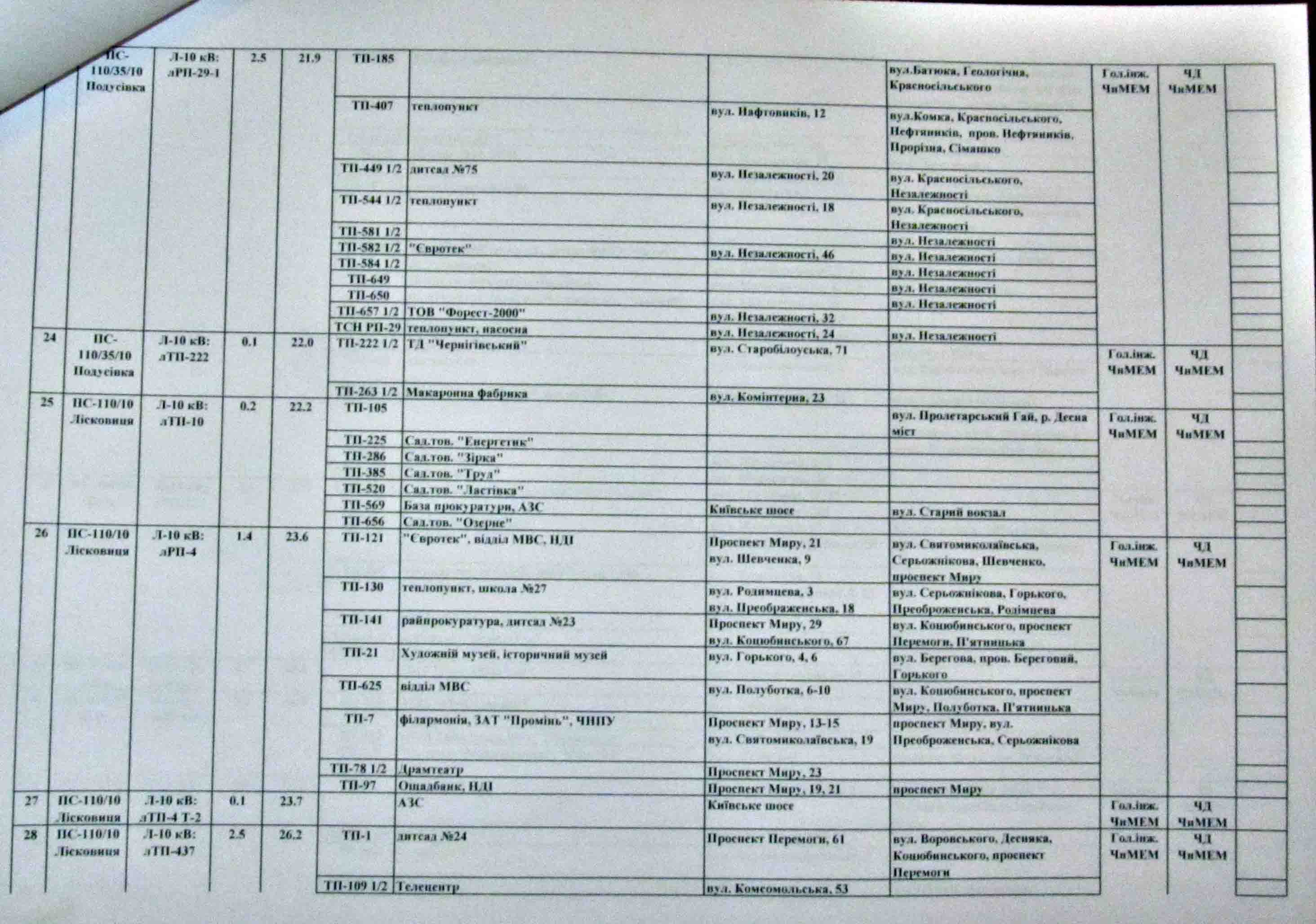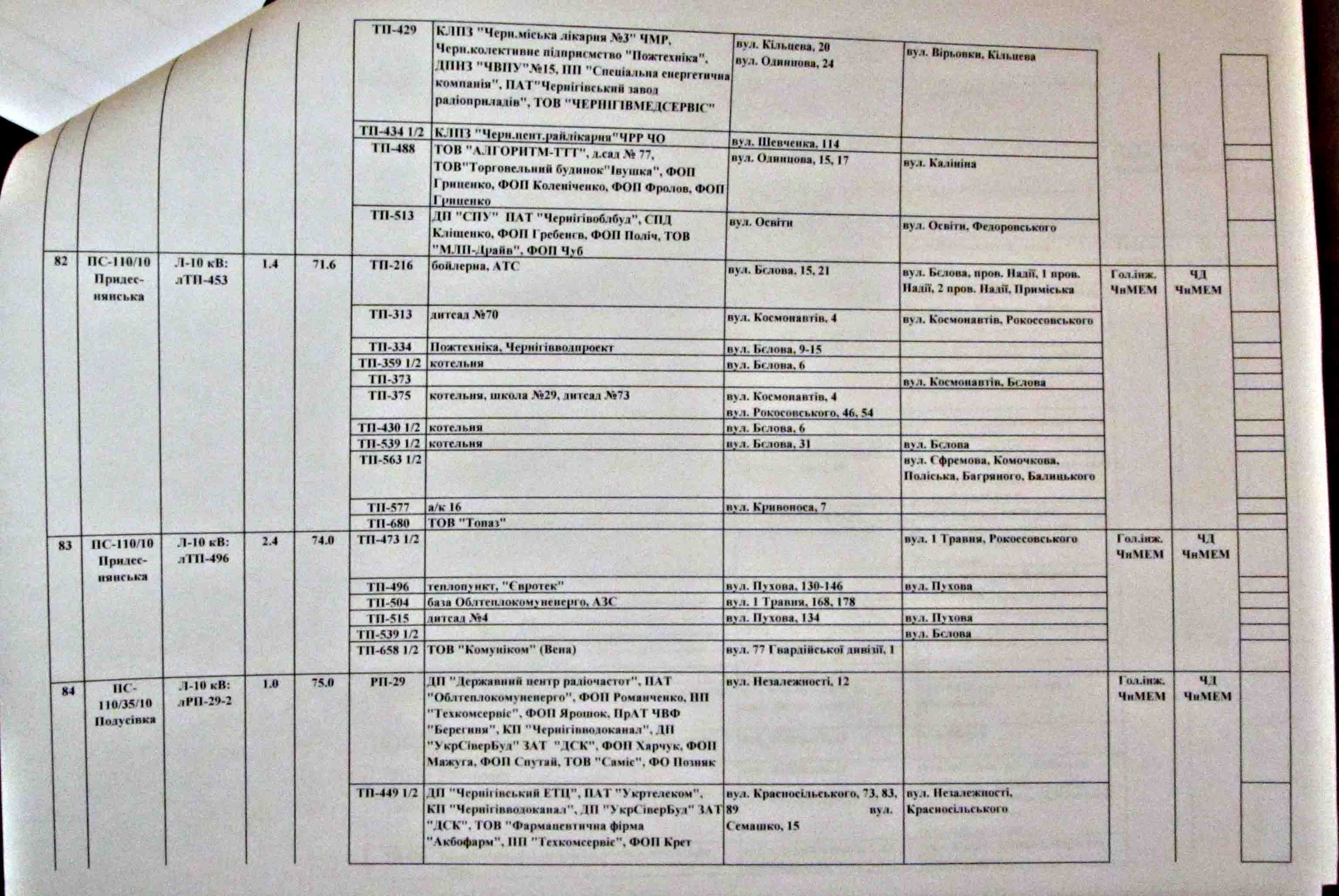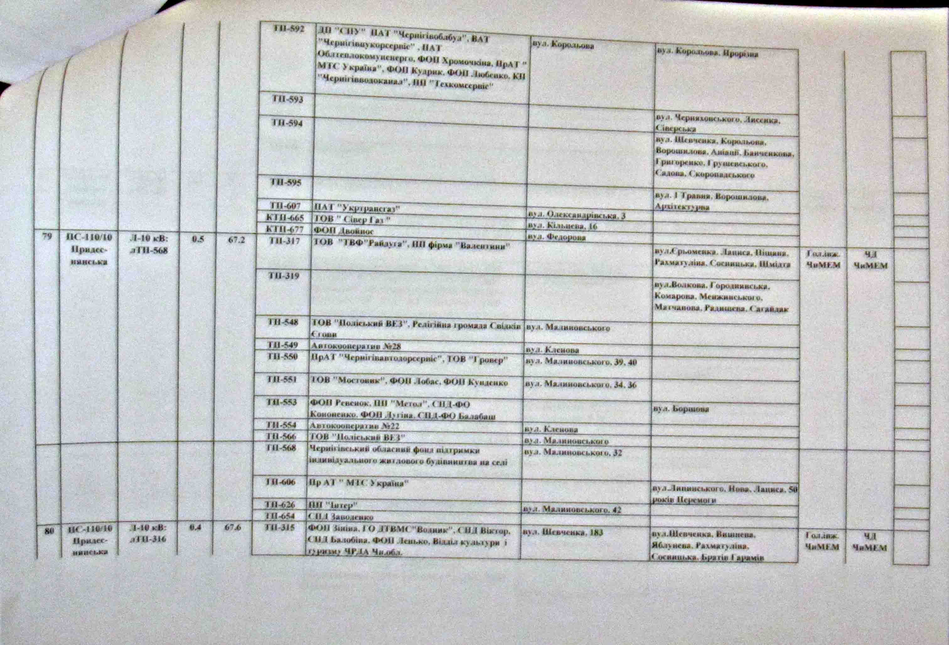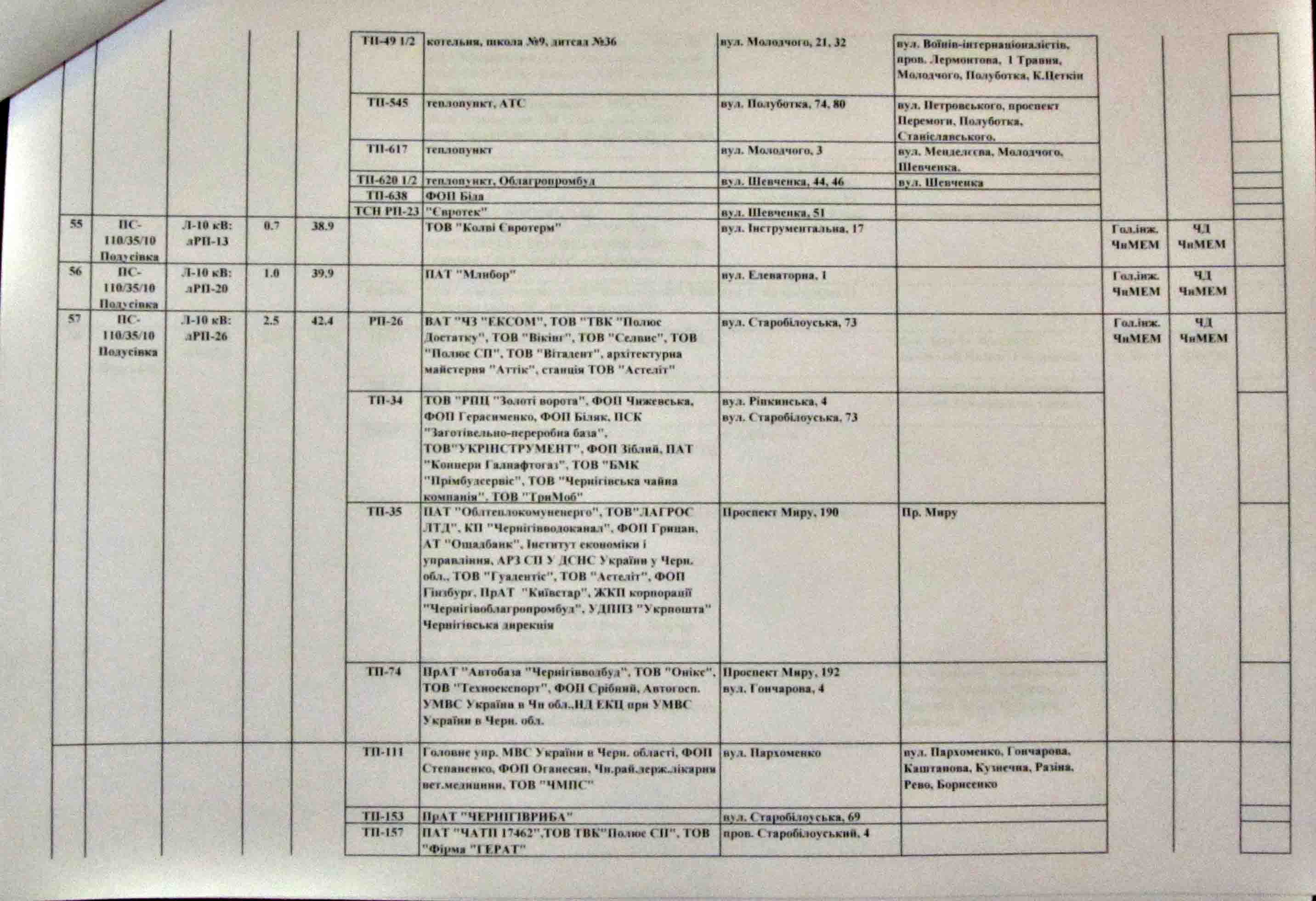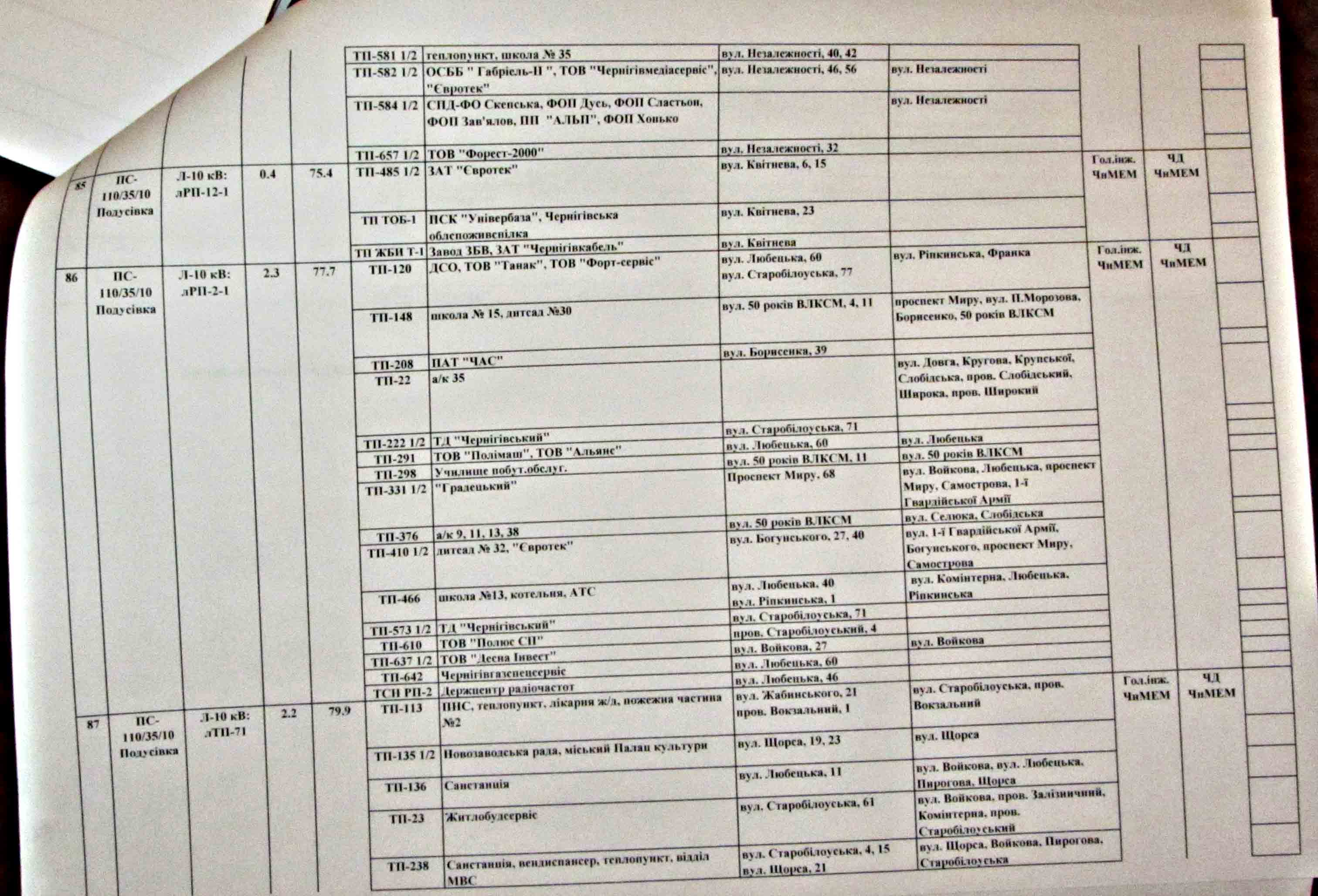 Графики отключения в электронном виде обещали разместить на сайте ПАТ «Черниговоблэнерго» в понедельник, 8 декабря. На данный момент редакция сайта располагает фотокопиями графиков отключения: как сокращенной, так и полной версией. В полной версии графика указаны не только очереди отключения, но и улицы на которых не будет электроэнергии, а также основные объекты, которые на этих улицах расположены.