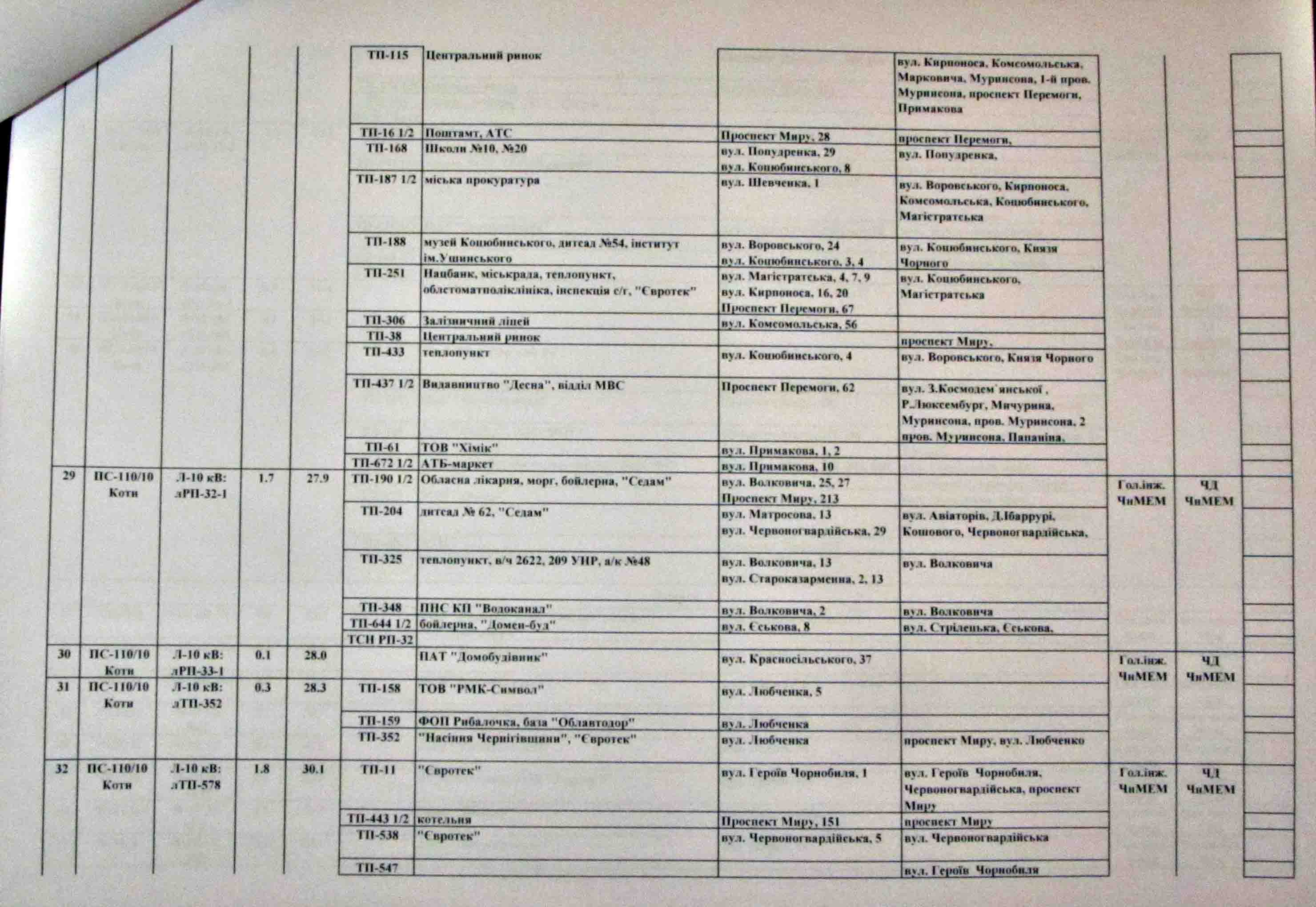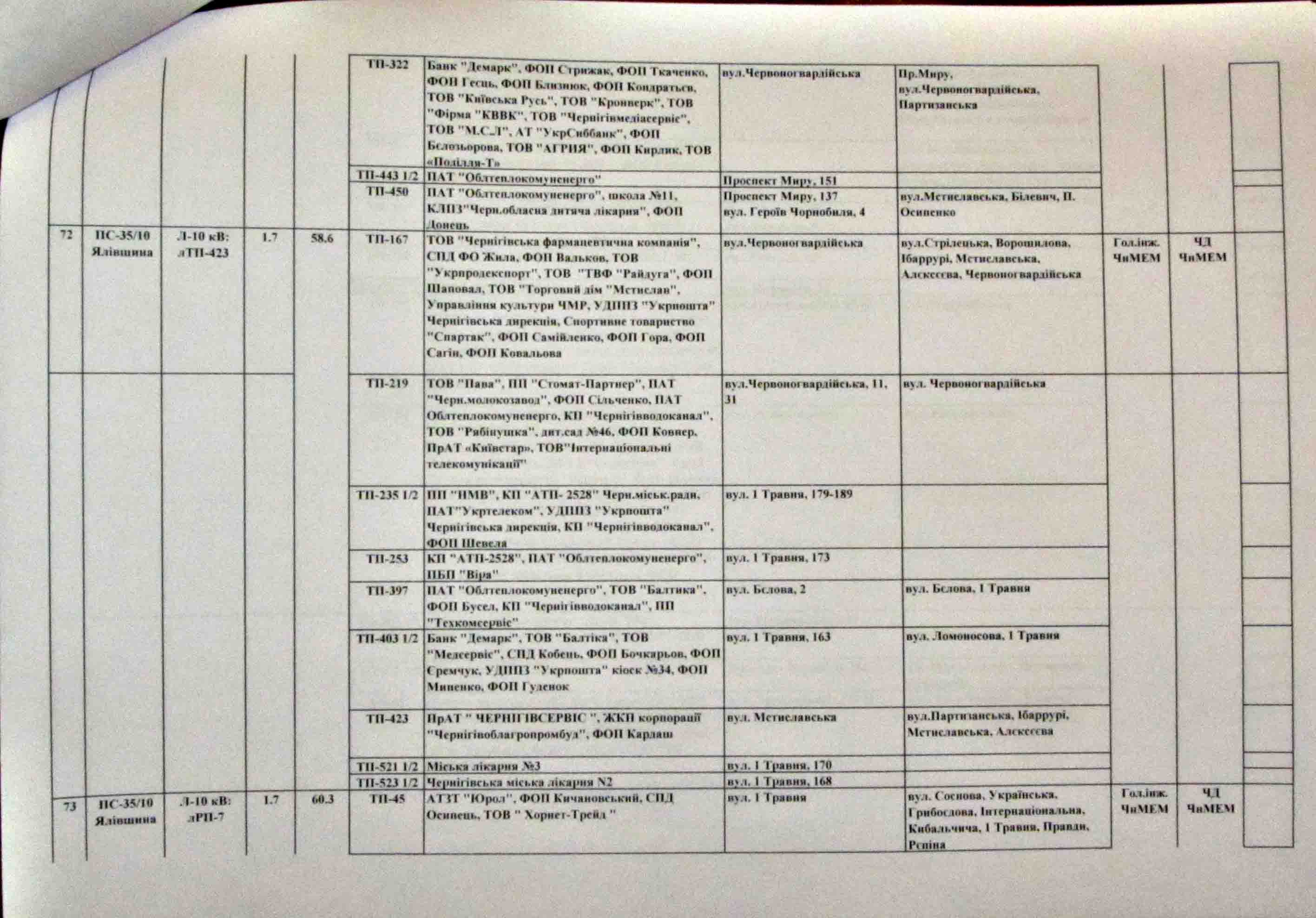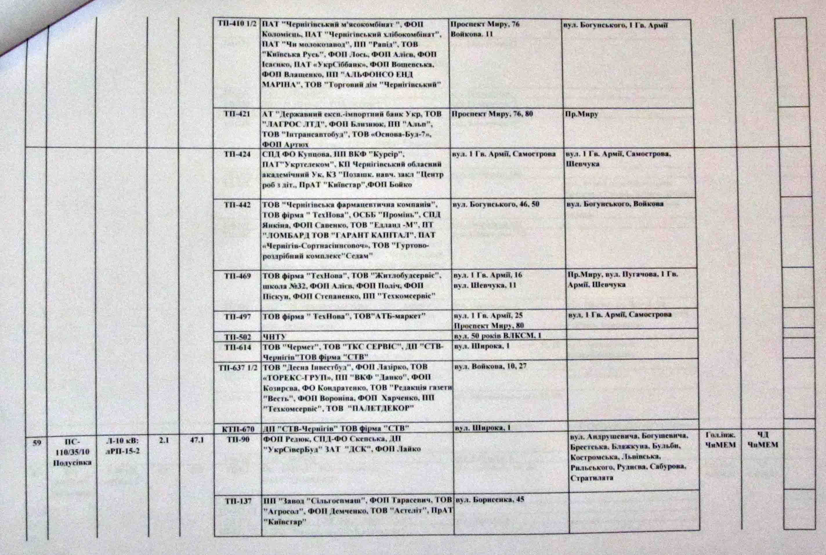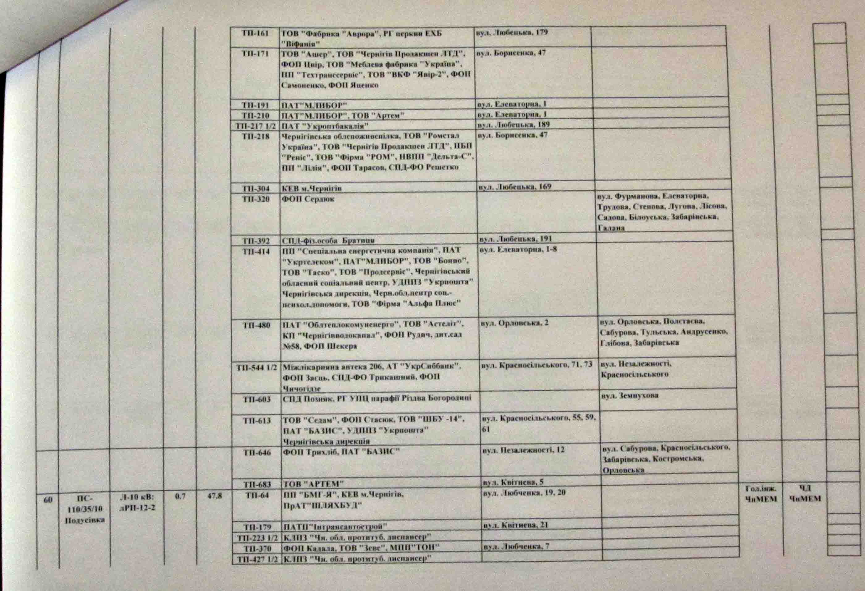 Графики отключения в электронном виде обещали разместить на сайте ПАТ «Черниговоблэнерго» в понедельник, 8 декабря. На данный момент редакция сайта располагает фотокопиями графиков отключения: как сокращенной, так и полной версией. В полной версии графика указаны не только очереди отключения, но и улицы на которых не будет электроэнергии, а также основные объекты, которые на этих улицах расположены.