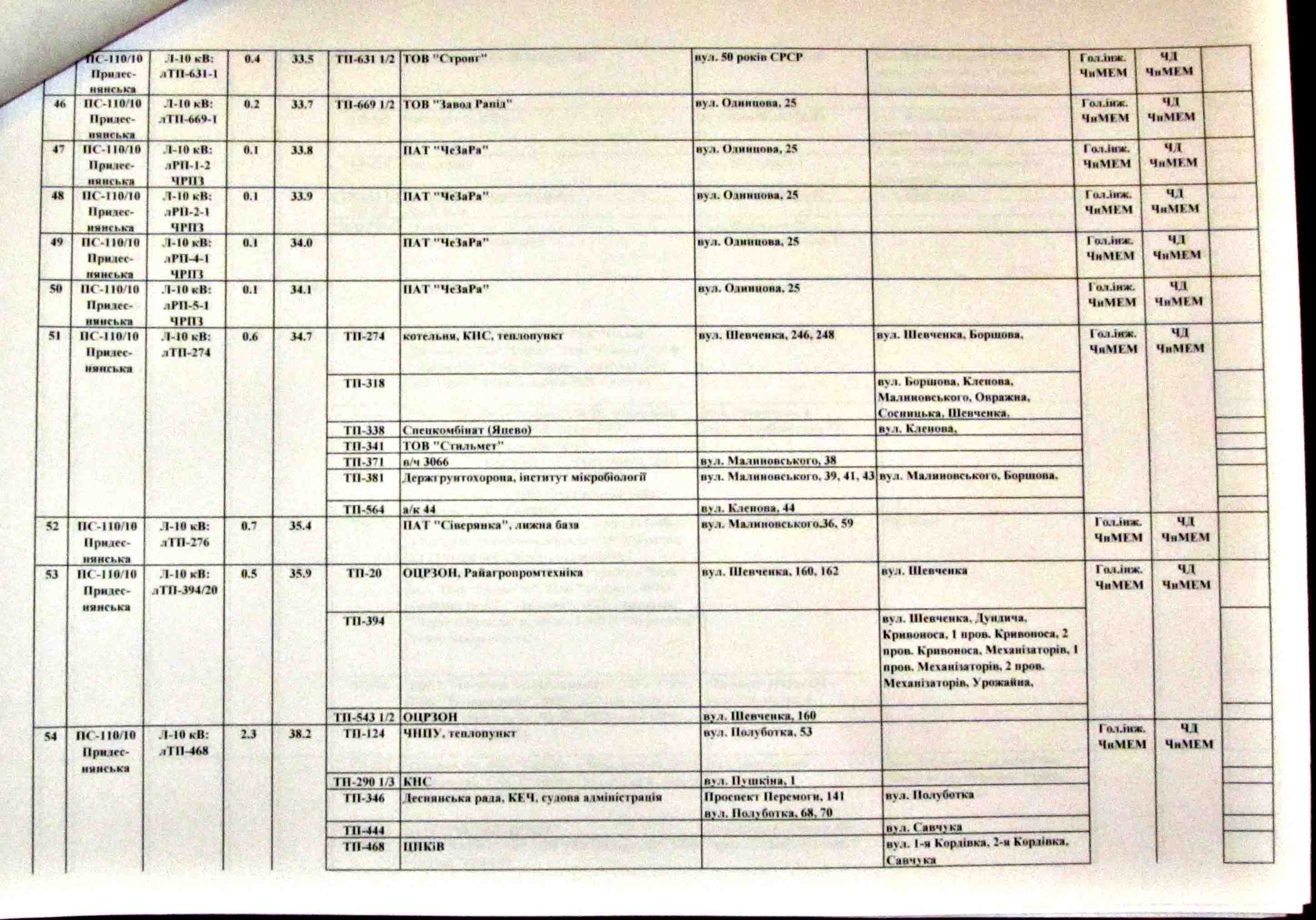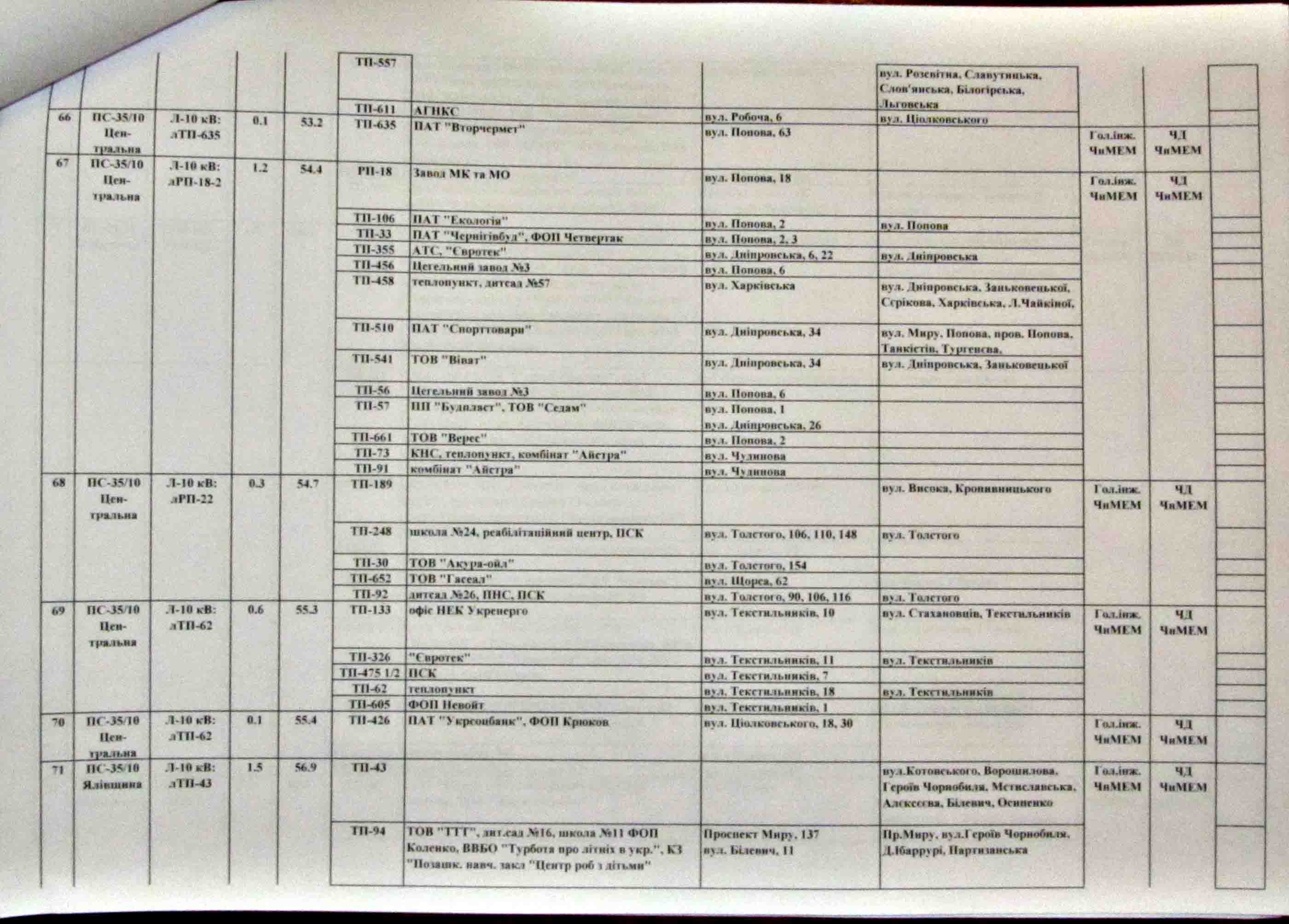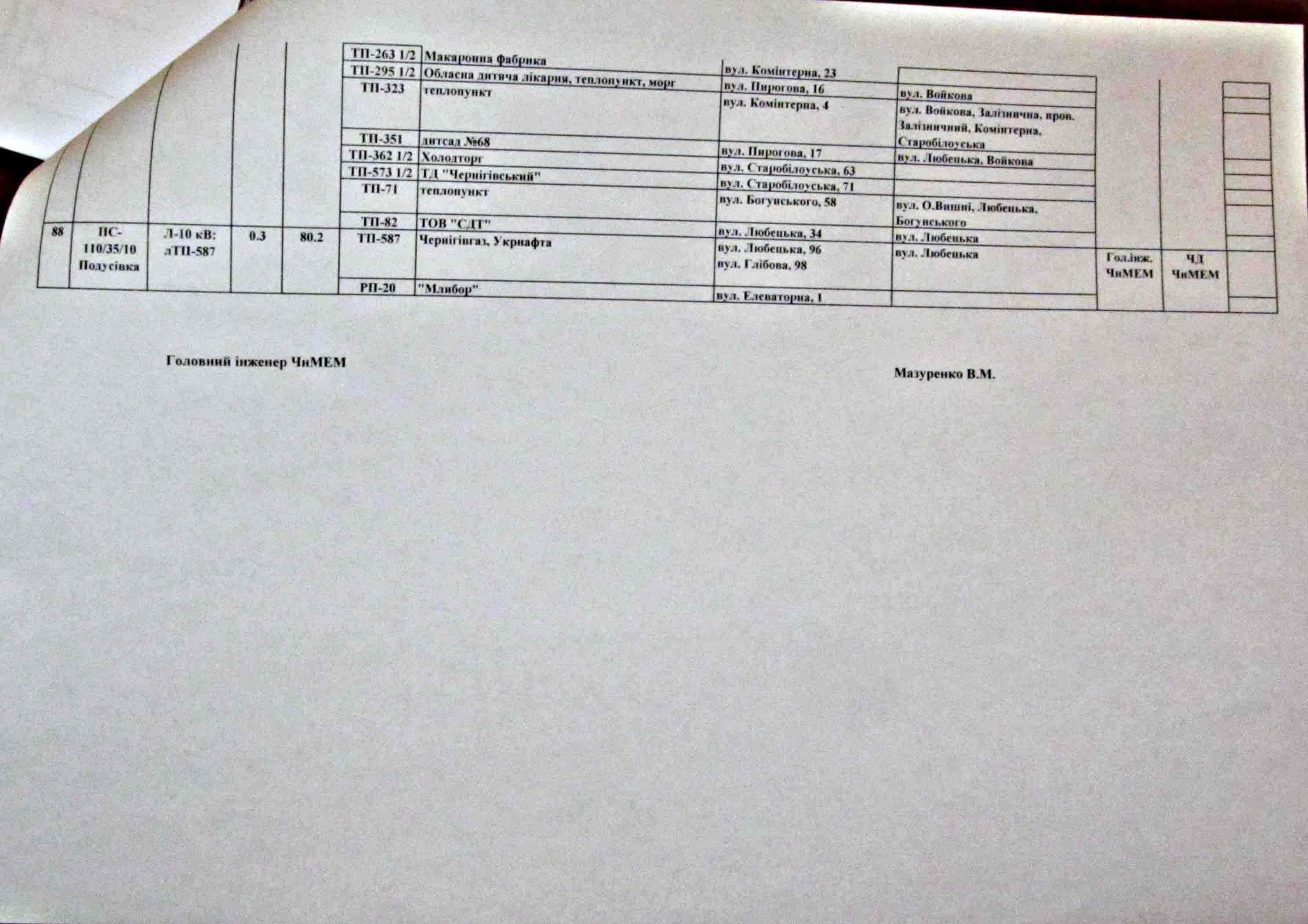 Также председатель правления ПАТ «Чениговоблэнерго» сообщил журналистам, что распоряжение городского головы о запрете отключения школ, садиков, больниц и котельных – невыполнимо с технической точки зрения. У предприятия нет такого количества бригад, которые могли бы выезжать и «в ручную» отключать объекты. Кроме того, на отключение дается 10 минут, а за такой срок произвести выборочное отключение просто не возможно физически.