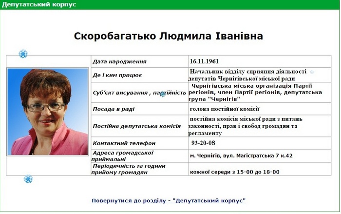 На сайте городского совета в разделе депутатский корпус, еще нет информации о новой должности. Местом ее работы значится работа в горсовете: начальник отдела содействия деятельности депутатов Черниговского городского совета. Кроме того, Людмила Ивановна возглавляет постоянную комиссию городского совета по вопросам законности , прав и свобод граждан и регламента.