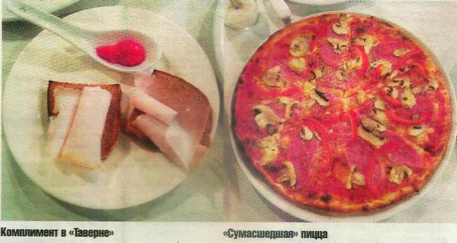 Практически вместе с чаем принесли две гренки с тонко нарезанным салом и хреном. Это так называемый комплимент, то есть подарок от шефа. В других заведениях Альфонсо гостям тоже раздают «комплименты». Бутерброды с помидором или брускетты. Сало в «Таверне» подают тем, кто заказывает пиво, пиццу. В общем, что-то сытное. Если же компания пьет капучино и заедает десертом, то «комплимент» может и не получить.