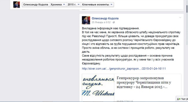 – Викладена інформація має підтвердження. В той же час мене, як керівника обласного штабу національного спротиву під час Революції Гідності, більше цікавить, чи доведе прокуратура своє розслідування щодо силового розгону Чернігівського Євромайдану до кінця і хто відповість за грубе порушення конституційних прав чернігівців. Просто зміна облич, а не системи і принципів роботи, результату не дасть. Саме відсутність результату щодо розслідування – основна причина незадоволення роботою прокуратури, як у мене так і у всіх учасників Євромайдану.