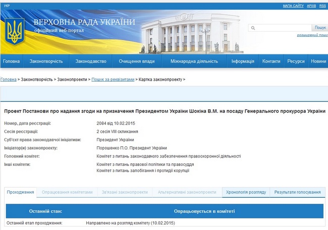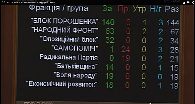 Несмотря на то, что Радикальная партия и фракция «Самопомощи» заявили, что выступают против назначения Шокина, кандидатуру Президента поддержало 318 депутатов. Против – 46 депутатов.