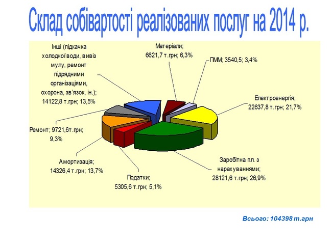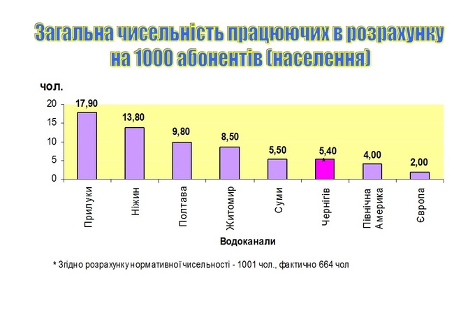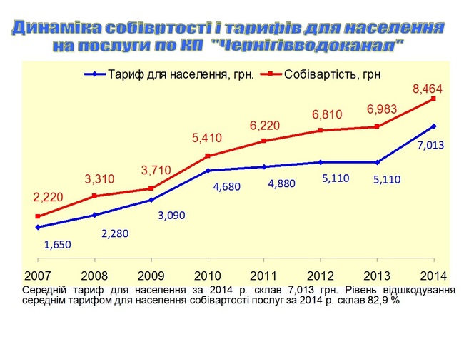 Нужно отметить, что работа водоканалов в Украине всегда была убыточной. Поэтому инвестированием программ по отрасли, как правило, занималось государство. Работали государственные программы, такие, как например, «Питьевая вода», по которым предприятия получали хотя бы какие-то крохи. Мало того, сегодня Национальная комиссия не занимается пересмотром тарифов. Поэтому за прошлый год окупаемость себестоимости продукции на КП «Черниговводоканал» составляла 79% и это несмотря на то, что на предприятии вдвое сократили расходы электроэнергии и оптимизировали численность персонала.