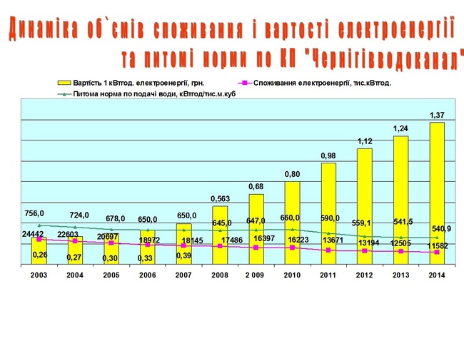 Те водоканалы, которые не смогли взять кредит от Всемирного банка, оказались в еще более затруднительной ситуации. Сегодня у них с одной стороны – фактически разрушенные производственные мощности, а с другой – многомиллионные долги за электроэнергию. За счет средств Всемирного банка КП «Черниговводоканал» реализовало десять проектов, направленных на эффективность, качество, экономию и надежность. Полученная от внедрения этих проектов экономия позволяла бы предприятию без особых усилий возвращать кредиты. Но постоянный рост электроэнергии, которая в тарифе – более 30%, и стремительный рост курса доллара стали серьезной проблемой на пути возврата полученных предприятием средств.