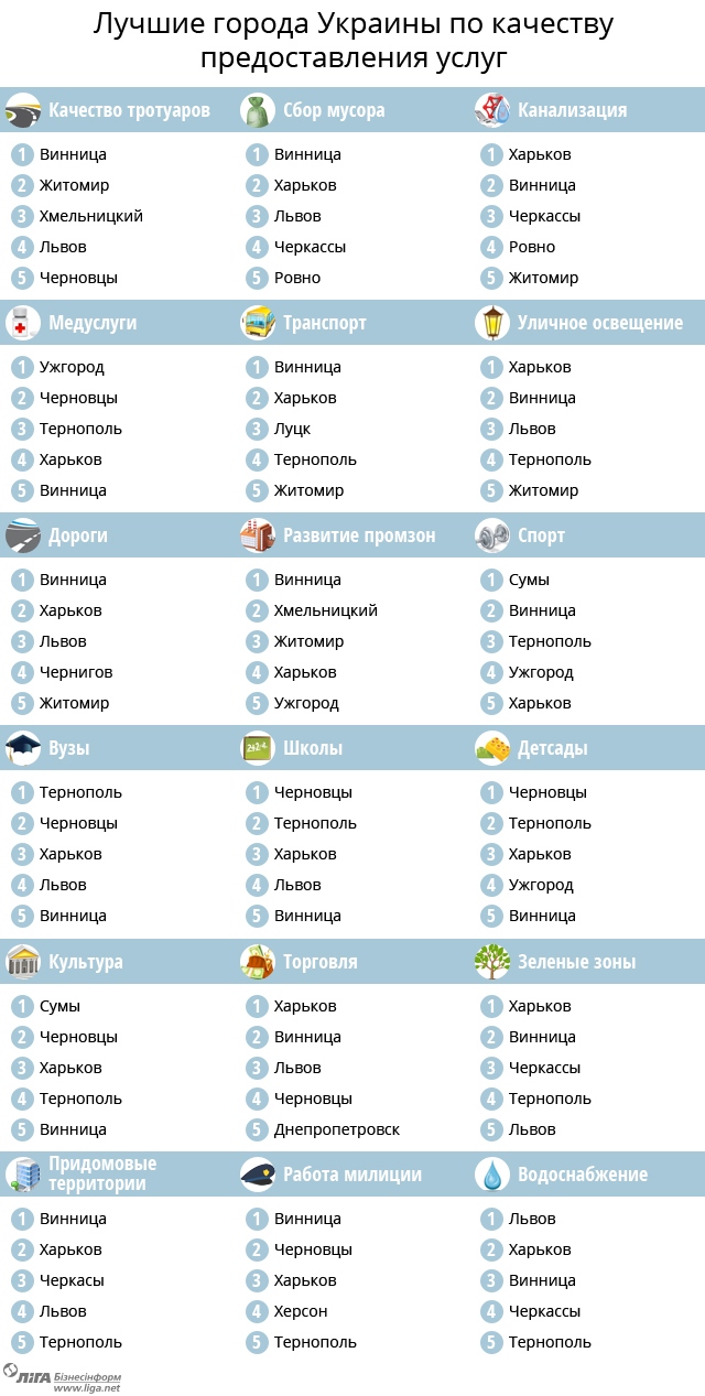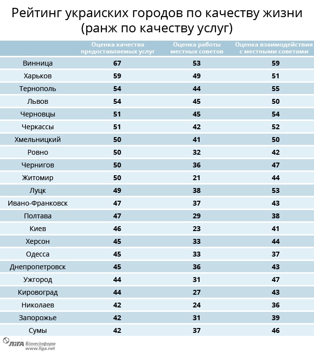 Винница входит в тройку лидеров по 13 показателям из 18 критериев, Харьков лидирует в 14 номинациях.