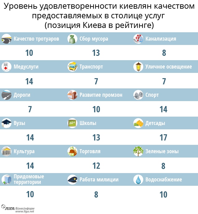 Эти населенные пункты практически эталоны (по сравнению с другими украинскими полисами) по уровню развития транспортной инфраструктуры - 57% винничан и 56% жителей Харькова считают, что она развита отлично и хорошо. Уличным освещением удовлетворены 59% жителей Винницы и 64% харьковчан. Довольны харьковчане и винничане уровнем развития и организацией торговли - эти города также во главе рейтинга. Что касается удовлетворенности развитием публичных зеленых зон в городе, то первенство снова-таки за Харьковом и Винницей.