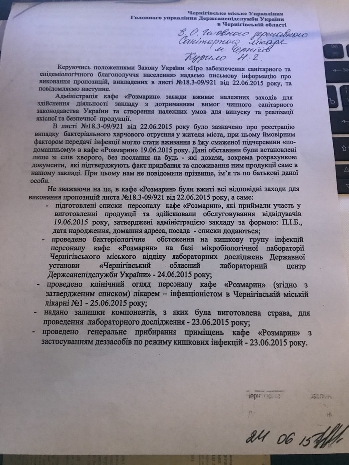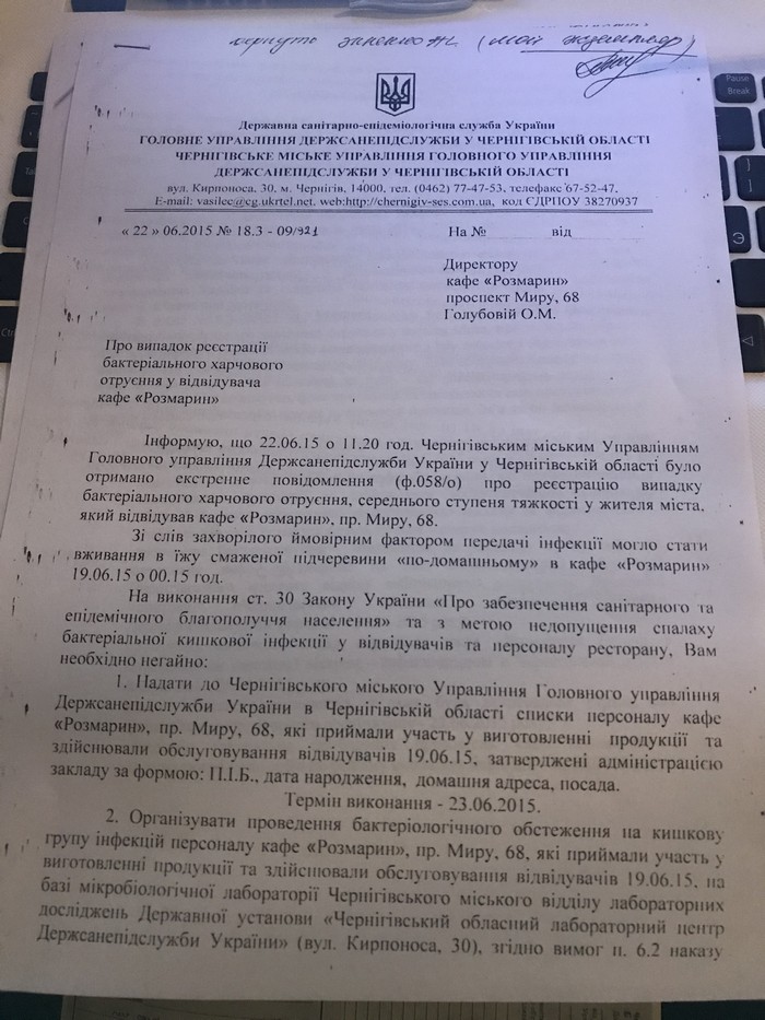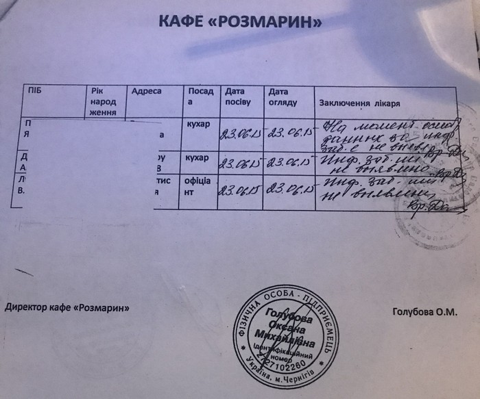 В редакцию интернет портала gorod.cn.ua обратился молодой человек по имени Федор, который после ужина в ресторане "Розмарин" был госпитализирован медиками с диагнозом "пищевое отравление сальмонеллой". По словам Федора, он заказал блюдо из мяса в ресторане "Розмарин", после чего через несколько часов начал ощущать недомогание, которое сопровождалось симптомами отравления.