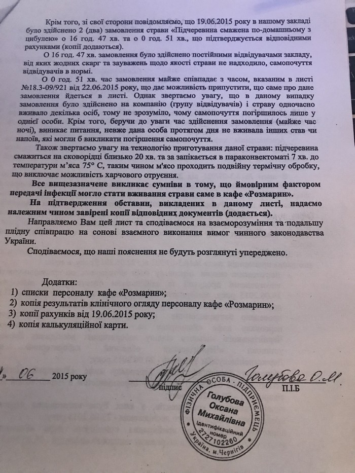 Во-вторых, отравление в кафе нарушило очень много моих личных и рабочих планов. Сейчас я живу не в Украине, а в Чехии. Я специально приехал в Чернигов на суд по одному важному для меня делу. После суда я должен был ехать в Одессу, а затем лететь в Прагу. В итоге все эти планы были не реализованы. Я заплатил юристу, оплатил билеты до Одессы, гостиницу в городе и, по сути, ничем этим не воспользовался. Все это материальный ущерб. Чтобы вы понимали, только за бронирование отеля в Одессе я заплатил 6000 гривен. Стоимость юриста - 3000 гривен. Плюс стоимость лечения. Из-за отравления накрылись все мои планы, поэтому я, конечно же, хочу, чтобы мне возместили как моральный, так и материальный ущерб.