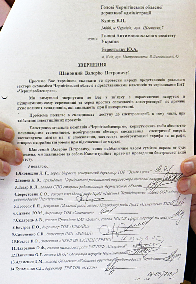 38 предпринимателей Черниговской области обратились к главе Черниговской ОГА Валерию Куличу с просьбой оказать влияние на компанию «Облэнерго». Владимир Ткач считает, что претензии – не обоснованы. Ни тарифы, ни суммы штрафов «Облэнерго» не утверждает. Все это регулируется на уровне Нацкомиссии, а предприятие только исполняет принятые постановления и решения.