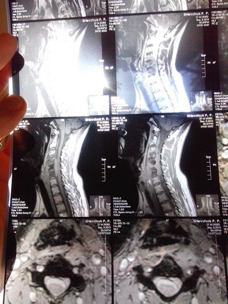 Понимая, что лечение в Чернигове не дает результатов, мы решили обратиться в Киев, в институт нейрохирургии. В Киеве мы сделали еще и МРТ шейного отдела позвоночника. Там также обнаружили большую опухоль, которая сдвинула и зажала спинной мозг. Из-за этого Паша не может ходить. Взглянув на результаты анализов Паши киевские врачи сразу же госпитализировали брата.