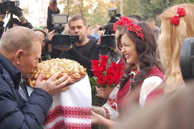 Зустрічали пана Президента з особливою пошаною - народними співами у виконанні солістів хору чернігівської Філармонії та хлібом з сіллю. Після офіційної зустрічі Леонід Данилович та ректор ЧНТУ Сергій Миколайович Шкарлет разом з колегами вирушили до актової зали, де пана Президента вже чекали студенти ЧНТУ, їх батьки та викладачі університету.