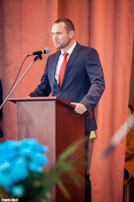 Я завжди перед вами великих речей не казав, бо розумію, що ви всі тут досвідчені та освічені люди, тим паче у вас прекрасний професорсько-викладацький склад університету. Тому, насамперед, я з великою радістю хочу сказати, що мені дуже приємно знов знаходитись у стінах цього університету, а по-друге, я хочу вас привітати з наступаючим святом, адже завтра Україна святкує "День захисника вітчизни". Це свято у наші дні має особливе значення, бо в Україні іде війна, при тому не громадянська. Сьогодні у нас начебто мир, але, як кажусь, коли є мир, то треба готуватись до війни. Так сталось, що ми до цього були не готові, на великий жаль. Мене часто питають: що буде завтра на Донбасі? І я відповідаю, що про це знає лише Господь Бог і Володимир Путін. Господь Бог не чує нас, нажаль, ну а до Путіна ми ще з вами не достукались, але ми намагаємось це зробити, бо хочемо, щоб на нашій землі був мир. Це було невеличке вступне слово, ну а зараз я з великою радістю хочу вручити стипендії найкращим студентам ЧНТУ.