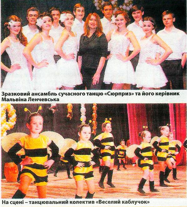 Щойно з Києва повернувся зразковий ансамбль сучасного танцю «Сюрприз», де здобув Гран-прі всеукраїнського конкурсу. Вже чверть століття колективом керує Мальвіна Ленчевська, педагог з великої літери. Захоплення танцями їй прищепив талановитий хореограф Володимир Дядечко. Народився він у Мені, своє сходження до мистецьких вершин розпочинав у районному Центрі дитячої та юнацької творчості. Нині очолює у Чернігові створений ним зразковий театр народного танцю «Слов’яни», майстерність та самобутність якого добре відомі в Україні та багатьох країнах Європи. Меняни, а серед них батьки і родичі маестро, цього вечора отримали справжню насолоду від темпераментних танців «Слов’ян».
