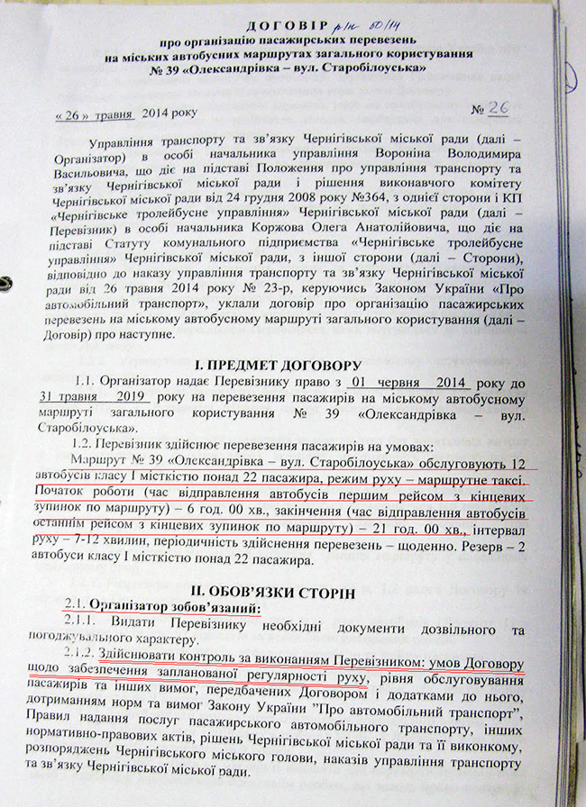 В понедельник, 18 апреля в автобусе №39 мы обратили внимание на объявление, в котором указывались новые начало и конец движения автобуса на маршруте. В Александровке маршрут заканчивался в 19.27, а на Старобелоусской – в 20.06. И это в то время, как договор, заключенный между КП «Черниговское троллейбусное управление» и управлением транспорта и связи Черниговского горсовета, предусматривает начало движения автобуса с 6 часов утра и окончание движения в 21 час. Нам стало интересно, почему и на каком основании некая «Администрация» сократила время работы маршрута, как минимум, на полтора часа?