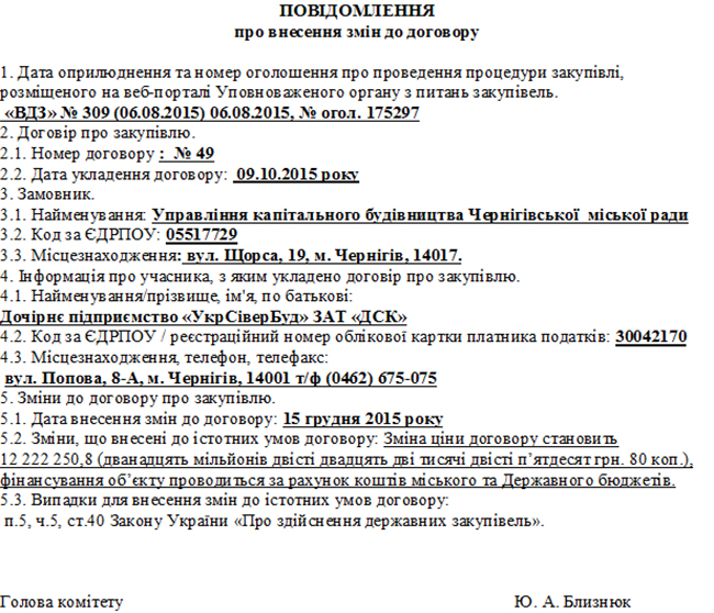 Дальше история с детским садом разворачивалась еще интереснее. Заказчиком реконструкции выступило Управление капитального строительства Черниговского городского совета, которое в августе 2015 года объявило открытые торги на право проведения работ по реконструкции нежилого помещения по ул. Коцюбинского, 50А. Стоимость работ согласно тендерной документации составляла 13 718 534 грн, из которых 8 000 000 грн через Черниговскую ОГА выделялось из Государственного бюджета (при содействии Фонда регионального развития), а остальные деньги город брал из своего бюджета.