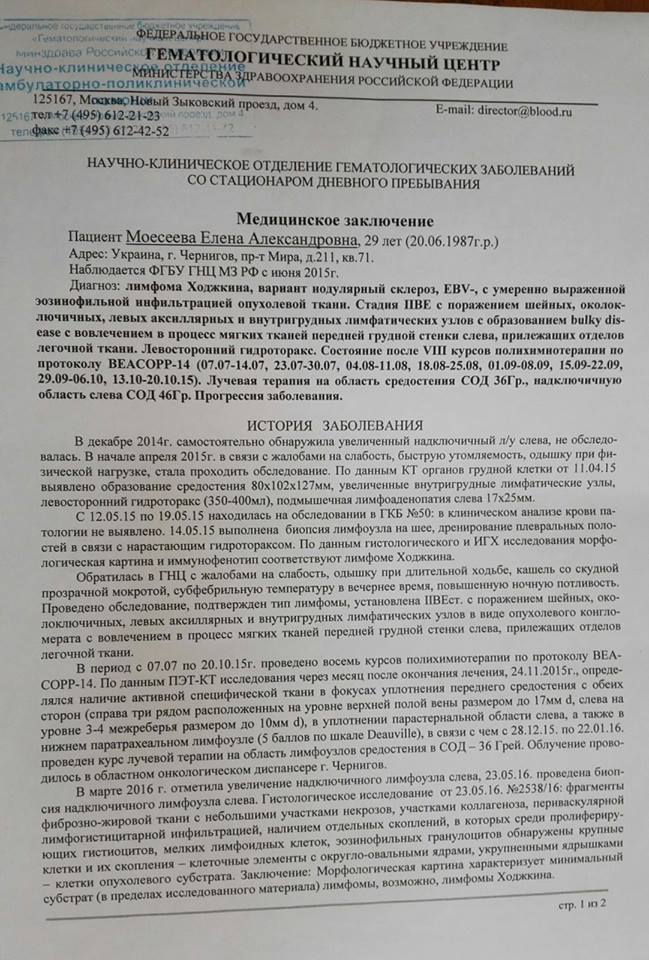 Черниговчанке Елене Моессевой в 2015-м году при обследовании в Гематологическом научном центре города Москвы поставили диагноз лимфома Ходжкина. Девушка в декабре 2014-го самостоятельно обнаружила увеличенный надключичный лимфоузел слева, но не придала этому значения. Впоследствии в апреле 2015-го ей пришлось обратиться к врачам, так как болезнь проявила себя через симптомы: слабость, быстрая утомляемость, одышка, повышенное потоотделение, вечером поднималась температура.