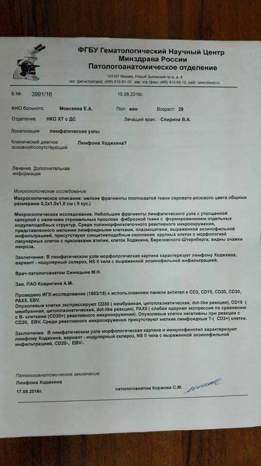 Диагноз врачей был неутешителен: лимфома Ходжкина, вариант нодулярный склероз, с умеренно выраженной эозинофильной инфильтрацией опухолевой ткани, стадия IIIВ с поражением шейных, околоключичных, левых аксиллярных и внутригрудных лимфатических узлов с образованием bulky diecase с вовлечением в процесс мягких тканей передней грудной стенки слева, осложнения: анемия III степени, лейкопения II степени.
