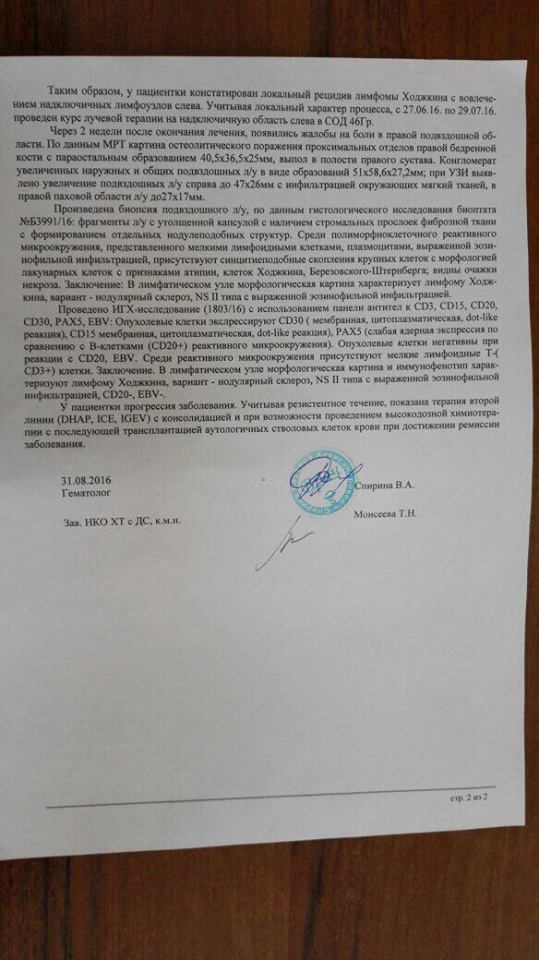 К сожалению, в конце августа доктора сделали заключение о том, что лечение Елене не помогло и случился рецидив с прогрессией заболевания. Теперь ей требуется еще и высокодозная химия и в дальнейшем трансплантация костного мозга. На данный момент она находится на обезболивающих препаратах.