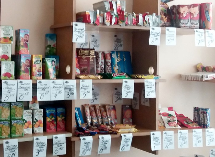 Чтобы узнать, как на самом деле обстоят дела, я побывала во 2-й городской школе и сразу направилась в столовую. К сожалению, было уже послеобеденное время, и в столовой уже никто не обедал, но в буфете можно было купить пиццу, соки, чай, шоколад, печенье.