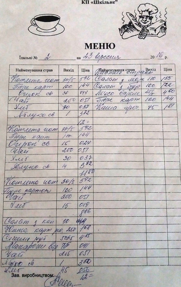 Людмила Вячеславовна предоставила график выдачи еды для детей младших и средних классов и меню на 23 сентября 2016 года, в котором указаны сначала блюда для детей-льготников (питание на 12 грн.), затем – для детей 1-4-х классов (горячее питание на 11,80 грн.), для старшеклассников (8,06 грн.) и горячее питание для группы продленного дня, в которое входит первое блюдо (12 грн.). Также, есть отдельное меню из диетических блюд.