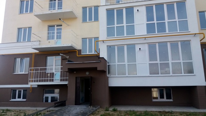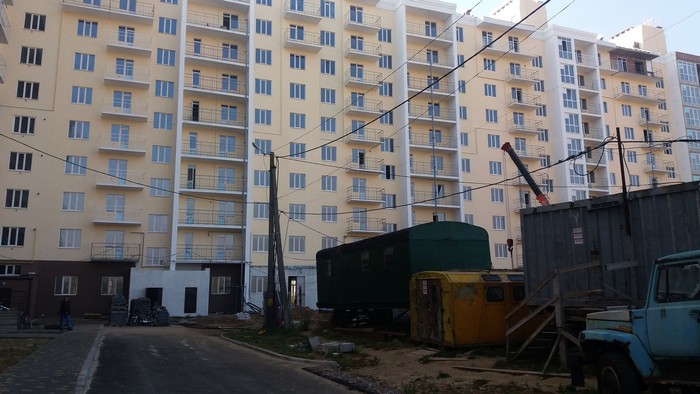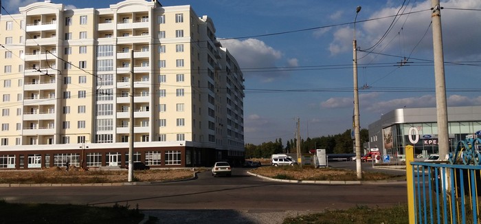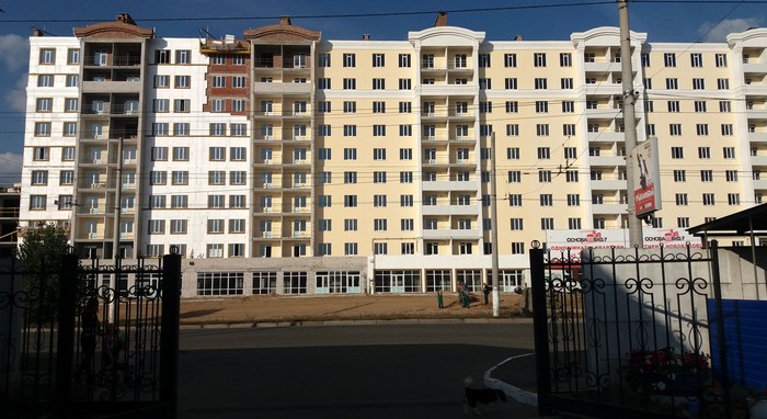 Хочется отметить, что внешний вид, выражаясь профессиональным языком, фасад дома, весьма привлекателен по сравнению с теми 9-тиэтажками, которыми наполнен наш город. Дом кирпичный, утеплен, оштукатурен и покрашен в мягкий светло-желтый цвет, на крыше над балконами привлекает внимание архитектурная деталь в виде полукруглого свода. В доме 9 этажей занимают квартиры, а на первом этаже выстроены помещения, которые сдаются в аренду. Т.е. всего в доме 10 этажей. На сегодня построено 5 корпусов и идет строительство 6-го корпуса. Это означает, что в 5-ти подъездах дома практически закончены внутренние строительные работы, и в скором времени жильцы должны въехать в свои новые квартиры. Во дворе дома еще стоят вагончики, продолжаются работы по строительству подъездных дорожек, и еще предстоят работы по благоустройству двора и детской площадки.