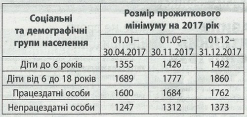 Крім того, передає Юридичний портал України, Законом України «Про Державний бюджет на 2017 рік» встановлено такі стандарти прожиткового мінімуму для основних соціальних і демографічних груп населення: