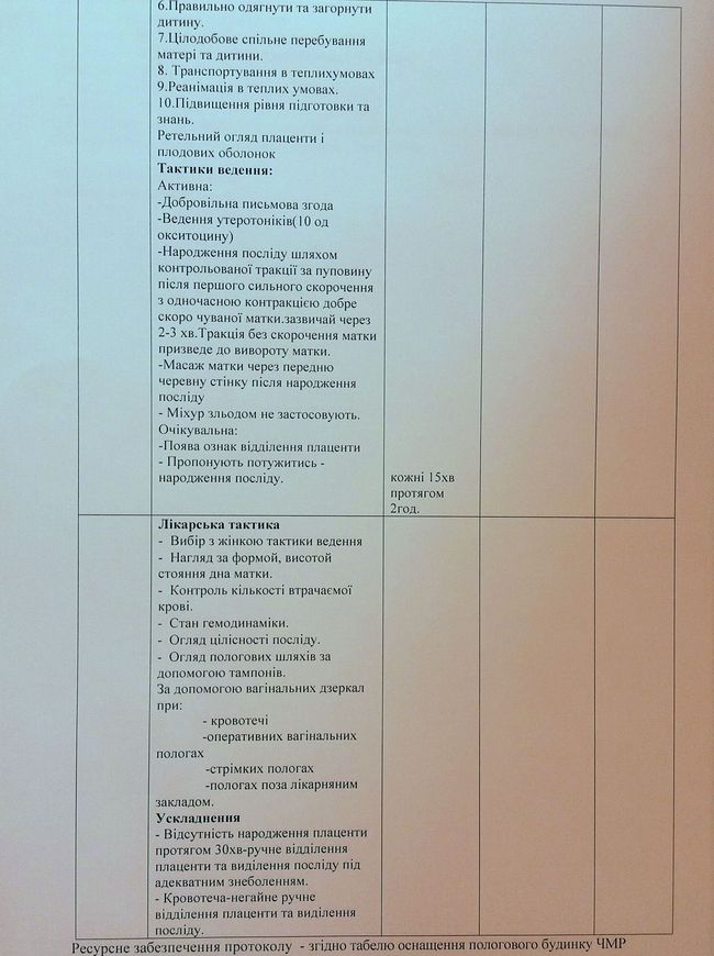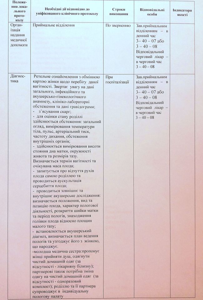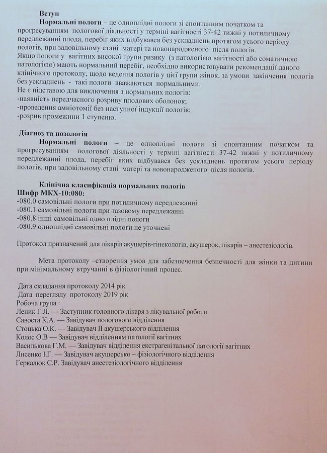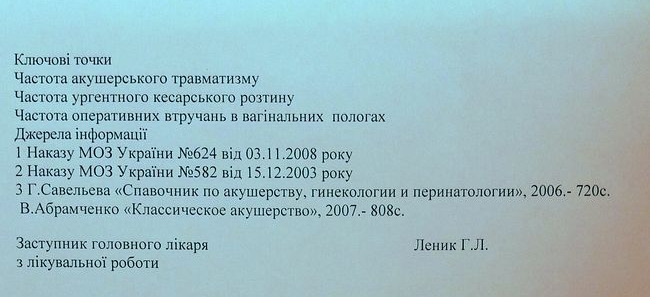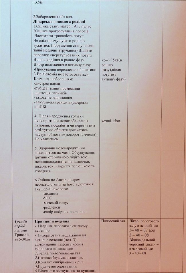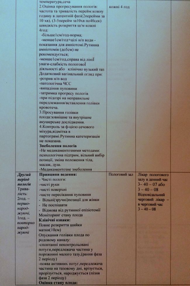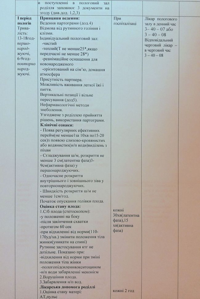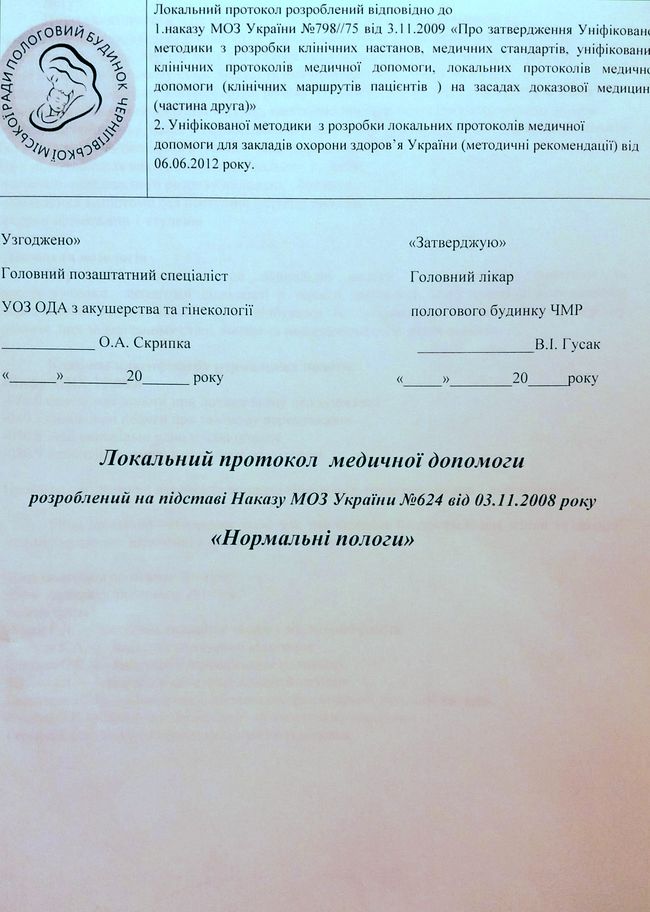 Крім цього, на підставі Наказу МОЗ України від 03.11.2008 року №624 «Нормальні пологи», в нашому пологовому будинку розроблений ще і «Локальний протокол медичної допомоги». В розділі «I період пологів. Принципи ведення пологів» прописано, що в нашому пологовому будинку для кожної породіллі передбачений чистий теплий індивідуальний пологовий зал, в якому вона може приймати вертикальні позиції і вільно пересуватися. У ньому не говориться про те, що жінка повинна народжувати строго в літотомічному положенні (на спині з розсунутими і трохи піднятими ногами). Інше питання, чи зручно жінці народжувати стоячи або сидячи?