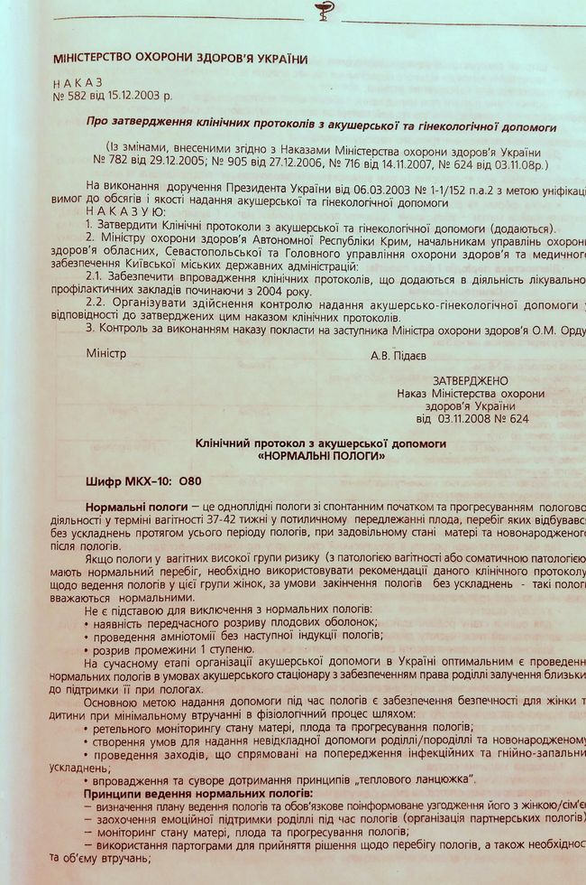 Документ от 2008 года. С удивлением узнала, что "Забезпечується можливість породіллі вибрати положення для народження дитини, яке є зручним для неї. Рутинне положення на спині (літотомічна позиція) супроводжується зростанням частоти випадків порушень стану плоду та пов'язаних з ними оперативних втручань у порівнянні з вертикальними положеннями (сидячи, стоячи), а також положенням породіллі на боці."