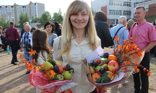 Незвичним подарунком вирішила порадувати вчителів мама п'ятикласниці Зіна Скорбатюк. Замість традиційних квітів – запашні фруктові букети. Груші, яблука, полуниця, і перев'язані натуральним джутом палички кориці оформлені в одну стильну композицію.