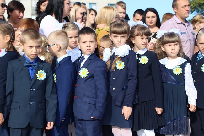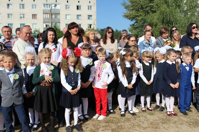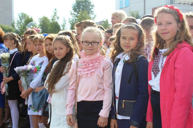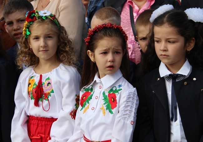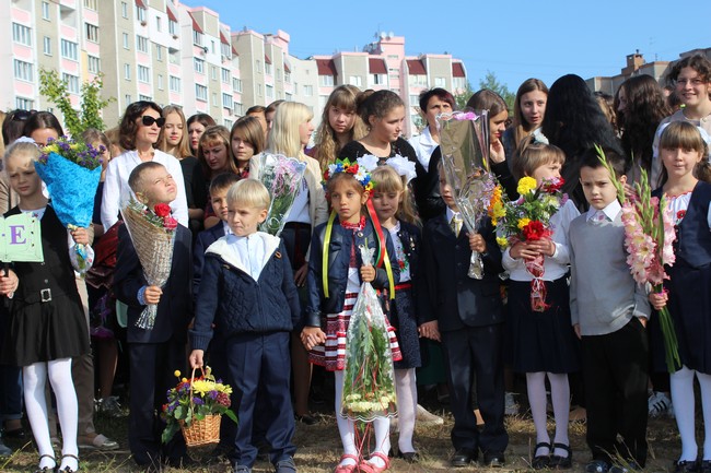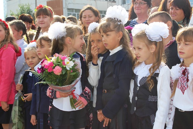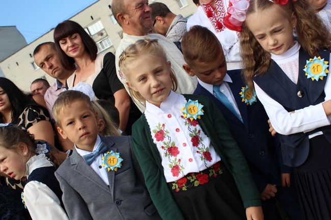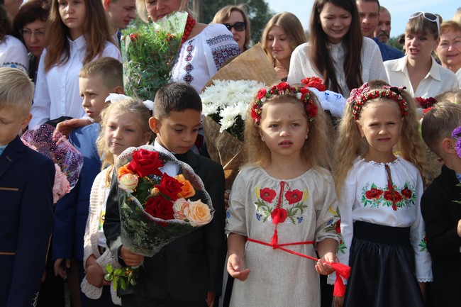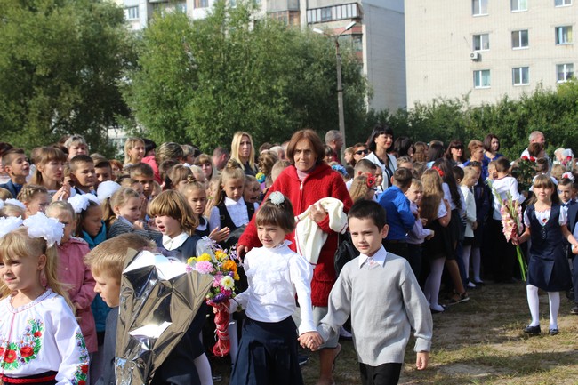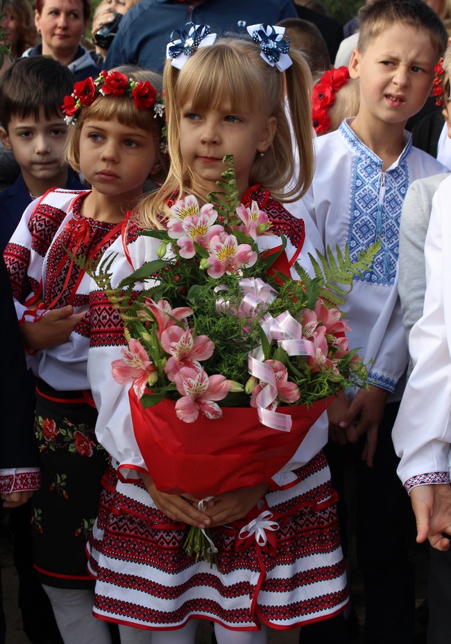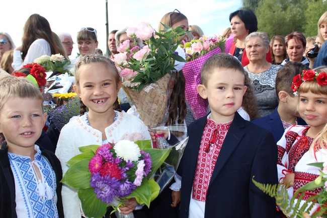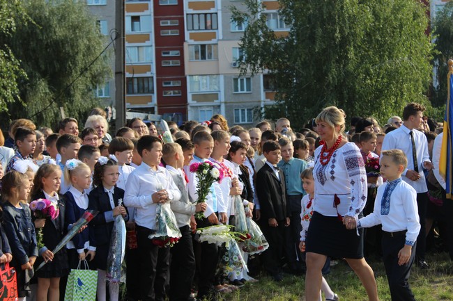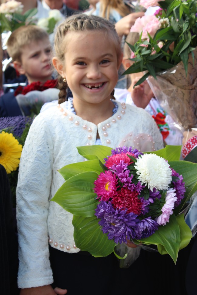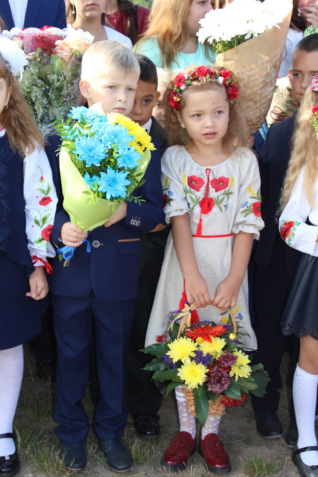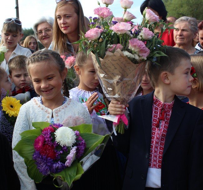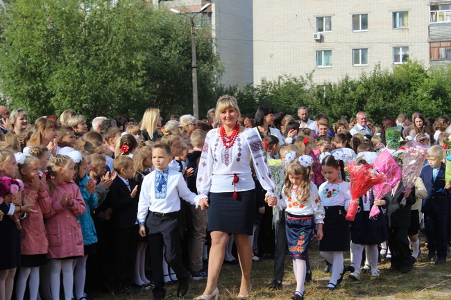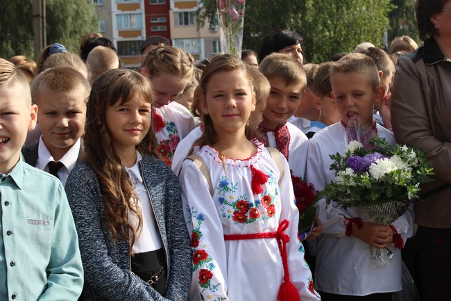 Але всі, як один - ошатні, з яскравими квітковими букетами в руках, щасливі і такі зворушливі! Дівчата в білих блузочках або українських вишиванках і синіх спідничках, з білими пишними бантами і віночками у волоссі, хлопчики - в костюмах і краватках, деякі теж у вишиванках, всі з акуратними модними зачісками.