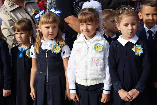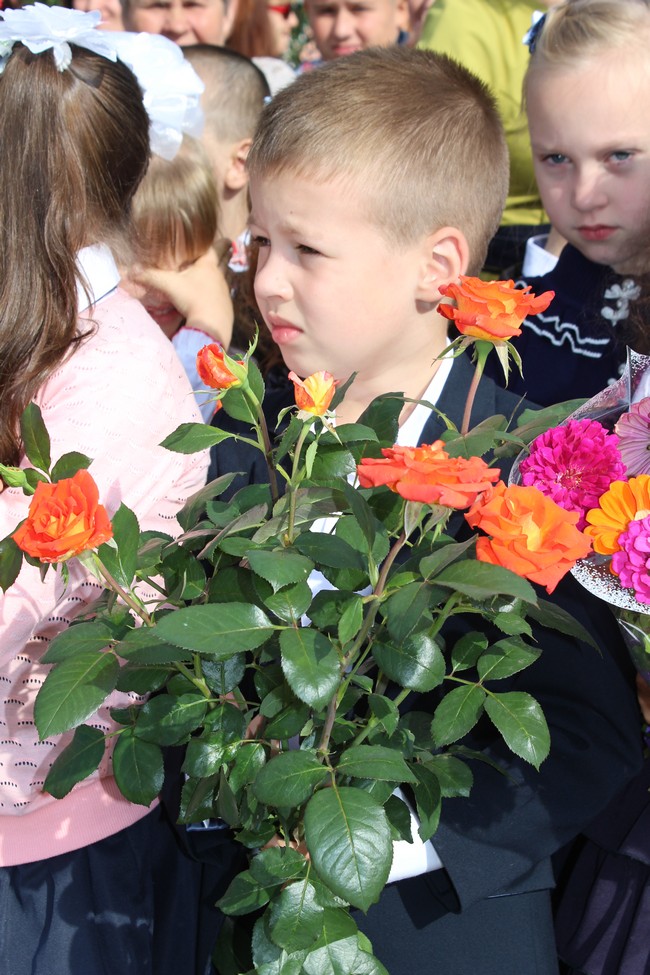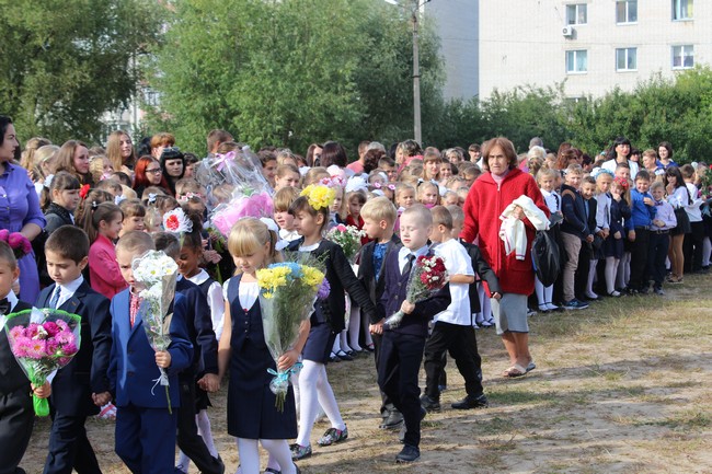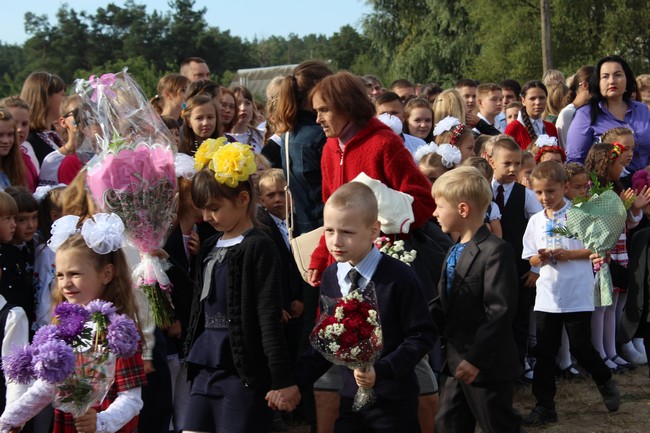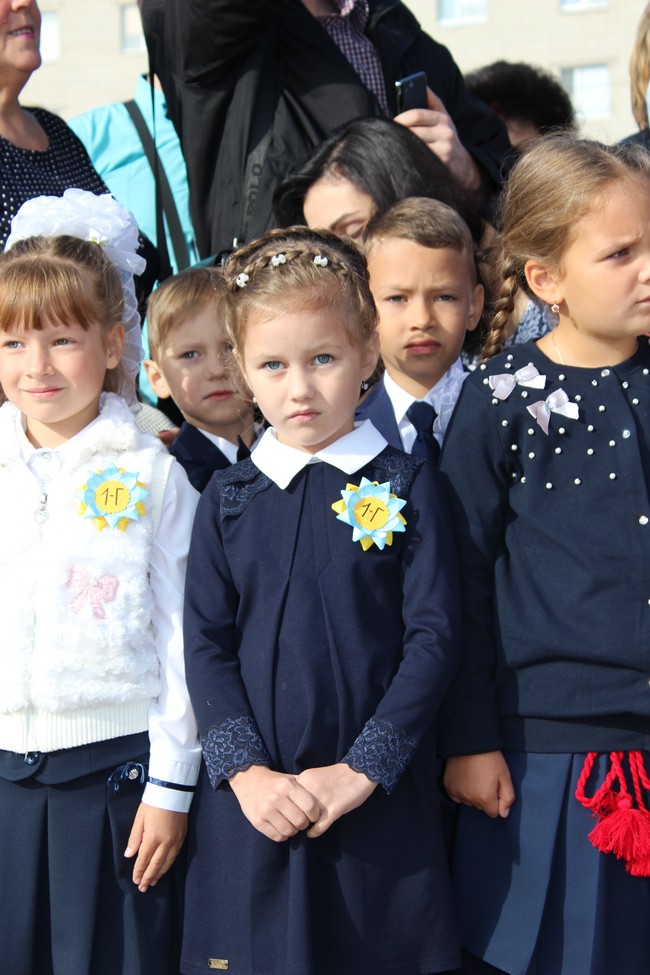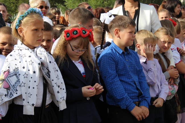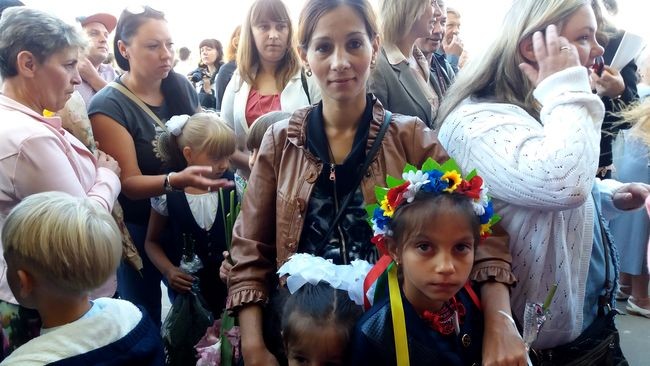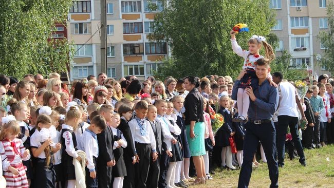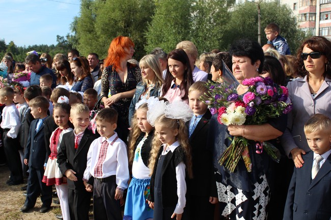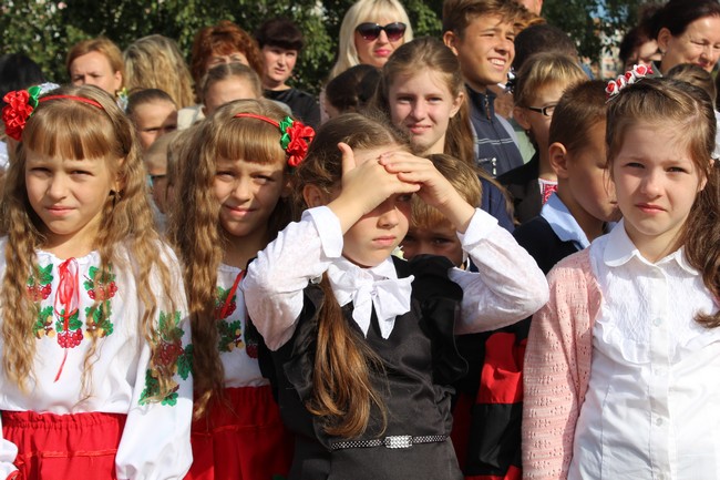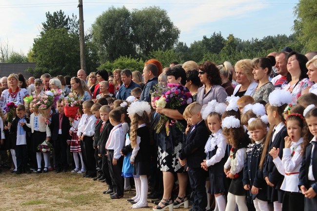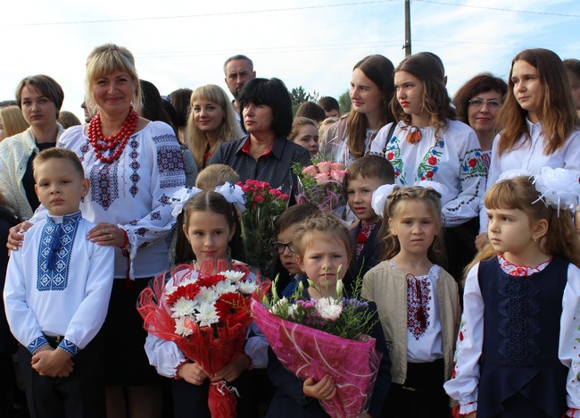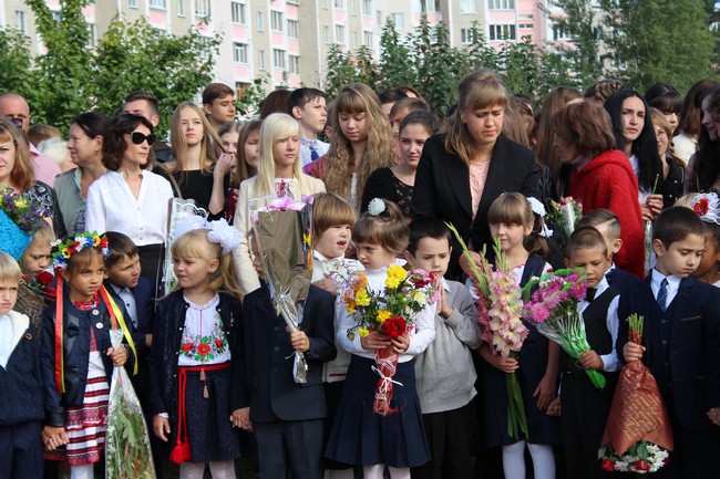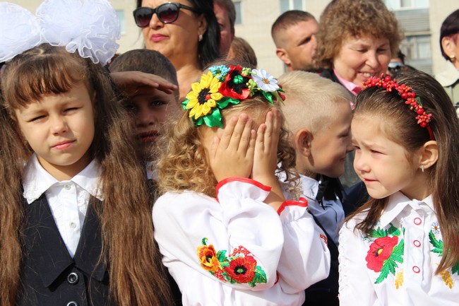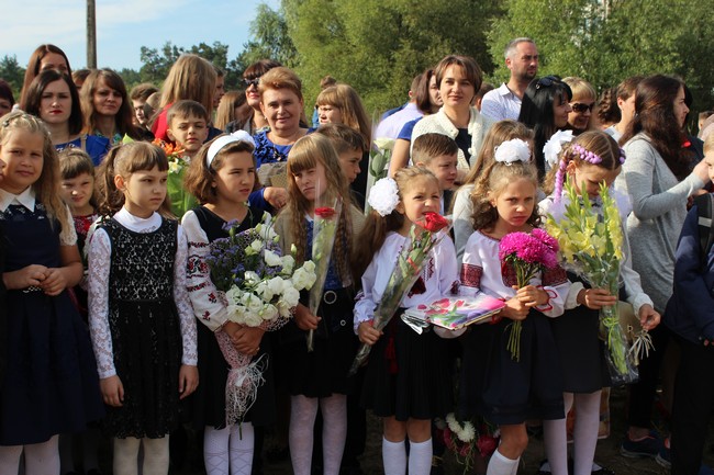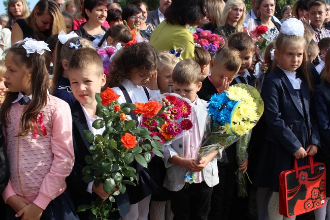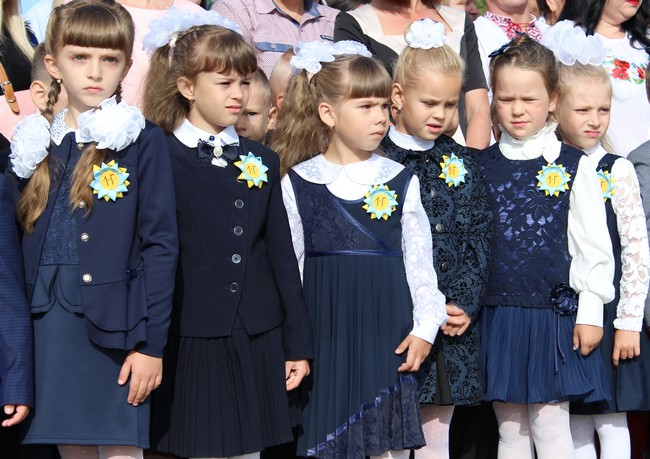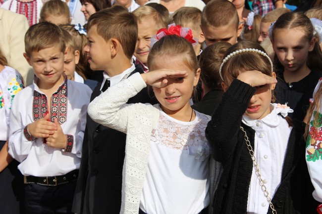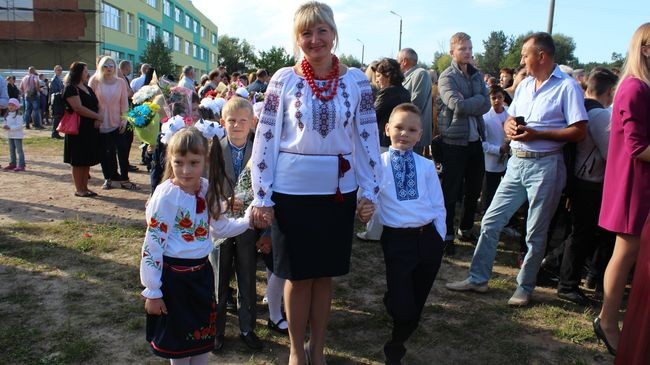Але всі, як один - ошатні, з яскравими квітковими букетами в руках, щасливі і такі зворушливі! Дівчата в білих блузочках або українських вишиванках і синіх спідничках, з білими пишними бантами і віночками у волоссі, хлопчики - в костюмах і краватках, деякі теж у вишиванках, всі з акуратними модними зачісками.