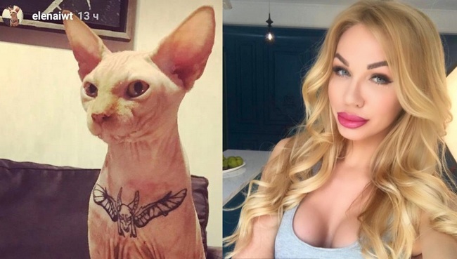 Владелицу сфинкса зовут Елена Иваницкая. На фото Девушка одета в черное платье и лифчик без бретелек Jasmine. Она ведет гламурный образ жизни, много путешествует, и выкладывает довольно откровенные фото на своей страничке в Инстаграме. Совершенствуя до неузнаваемости свое тело, хозяйка приобщила к гламуру и кота.