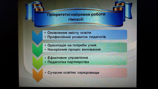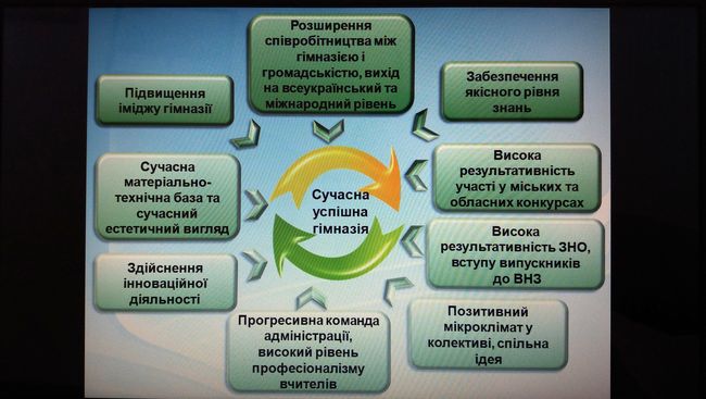 схематично змалювала, що з себе повинна представляти успішна сучасна гімназія; як повинні розвиватися педагоги в професійному напрямку; чотири основні етапи розвитку гімназії до 2023-го року та інше.