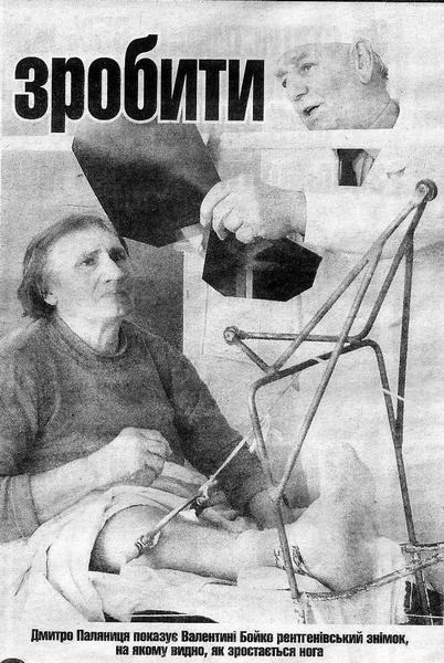 — Остеосинтез гомілки зробили без операції, — розказує Дмитро Паляниця. — Був закритий осколковий перелом нижньої третини правого стегна зі зміщенням по ширині та довжині. Рекомендувалося оперативне лікування. Металоостеосинтез. Металева конструкція, шурупи. Пацієнтка категорично відмовилася — за браком коштів.