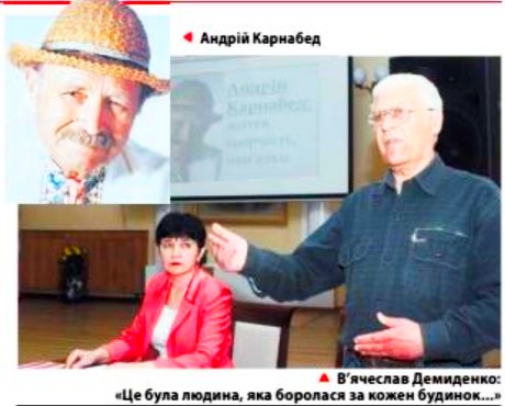 Чому саме Андрієві Карнабеду присвячено? Бо це визначна постать в історії післявоєнного Чернігова, людина, яка відчайдушно воювала за наше місто, прагнучи зробити його кращим. Він - відомий архітектор, художник, краєзнавець. дослідник чернігівських старожитностей. автор (і співавтор) близько 300 проектів будівництва та реставрації споруд нашого міста. Цікаву характеристику навела у своєму вступному слові завідувачка відділу мистецтв бібліотеки їм. В. Г. Короленка Лариса Поліщук: