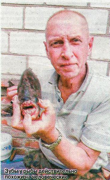 - В воскресенье. 8 июля, в День рыбака, мы поехали на реку Сож, — куда именно, его 41-летний зять Роман не признается — не сдает рыбное место. — Порыбачили и после часа уже собирались уезжать. Вдруг на спиннинге зазвенел колокольчик. Мы бросились вытаскивать. Рыба была тяжелая — спиннинг согнулся почти пополам. Сначала думали, что это лещ. По форме рыба была похожа на него, но другая по цвету. И чешуя не такая, как у линя или у сома, а мелкая, как у щуки. Присмотрелись: зубы - как у человека. Бросили рыбину в садок, так она пыталась перегрызть сетку.