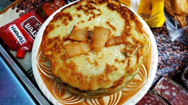 Деруни та картопля, смажена на великій пательні з цибулею та шкварками.
