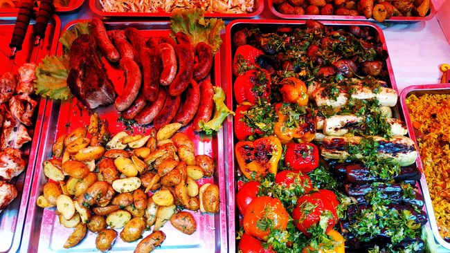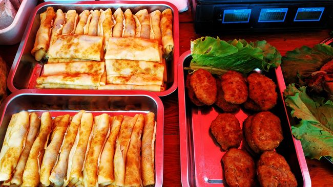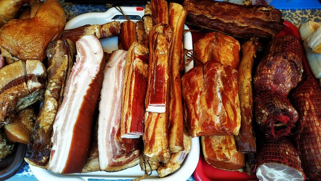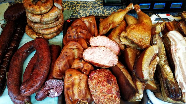 І просто гори різних копченостей, буженини, м'ясних рулетів, домашньої ковбаси, курятини тощо.