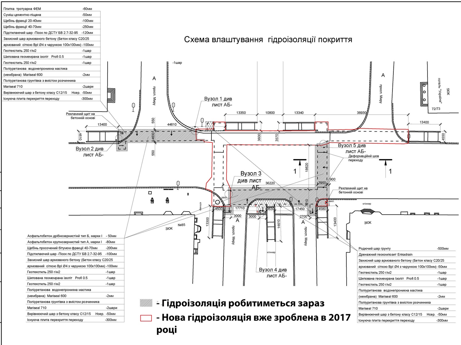 На схемі нижче видно, над якими частинами підземного переходу гідроізоляція вже нова, зроблена в 2017 році, а над якими – відслужила більше трьох десятиліть: