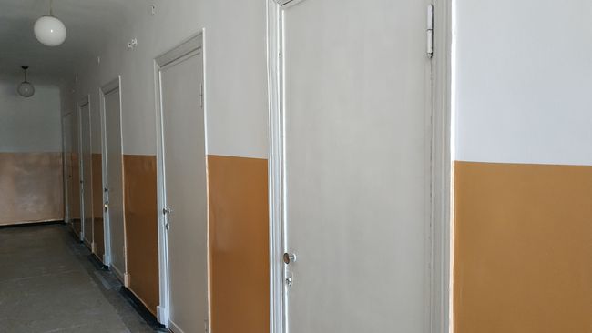 На сегодня полностью покрашены все стены, двери, на которых осталось повесить таблички. Произведена замена светильников.