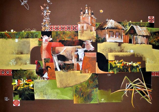 Рапсодія — інструментальний твір, вид музичної фантазії на народні теми. Подібне ускладнення простих фігур показує певну динаміку, рух та невловимість цього явища. Загалом, ця картина звертається до класичного пейзажного мотиву і традиційного для українського живопису мотиву життя в селі, і включає його в наш динамічний час.