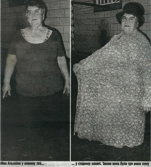 70-річну Ніну Альохіну у Борзні, як то кажуть, знає кожен. Колишня підприємниця з 25-річним стажем їздить на скутері та мікроавтобусі, тримає більше 30 кіз. Та найбільшої популярності і шани жінка заслужила близько трьох років тому, коли їй вдалося за півроку схуднути на півсотні кілограмів (зі 140 до 90) і на 10 розмірів — з 66-го перейшла на 54-56. Після того Ніна Іванівна вирішила не економити на собі. Взяла 15 тисяч гривень кредиту. І купила для нової себе новий одяг та взуття. З кредитом давно розплатилась, а гарне вбрання залишилось.