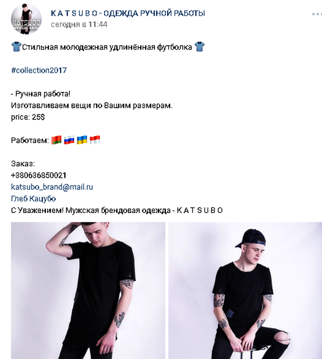 В определенный срок Глеб забрал в ателье сшитые первые 9 моделей мужских маек, футболок с коротким рукавом и лонгсливов (футболок с длинным рукавом), нанял парня-модель и фотографа, буквально на днях создал группу в Инстаграме и на своей странице в ВКонтакте, разместив фотографии со своими моделями. И парень потихоньку стал получать заказы на индивидуальный пошив. Свою первую футболку он оценил в 25 долларов.